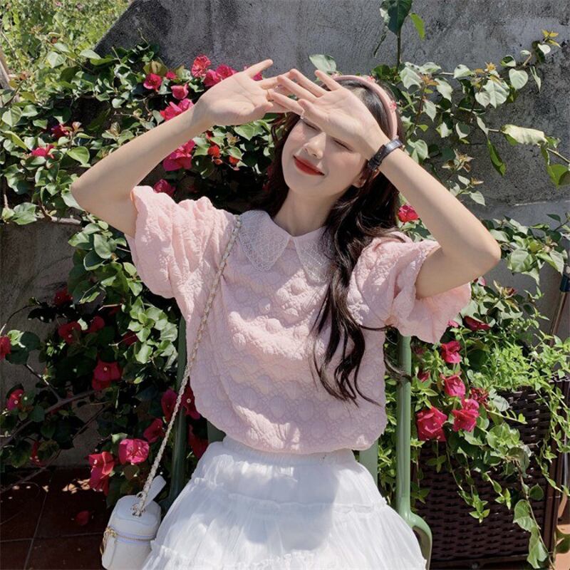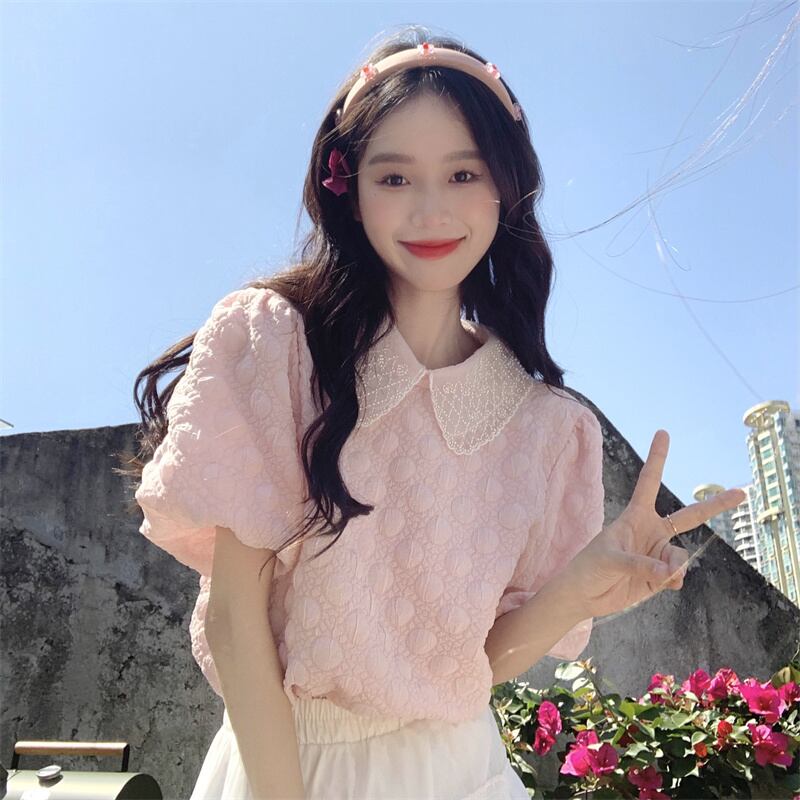 Sweet pink doll collar shirt women's high-end summer 2022 new chic design puff sleeve top trendy ピンク 大人ガーリー スウィート キュート カジュアル サマー 夏物 0921987208521990
