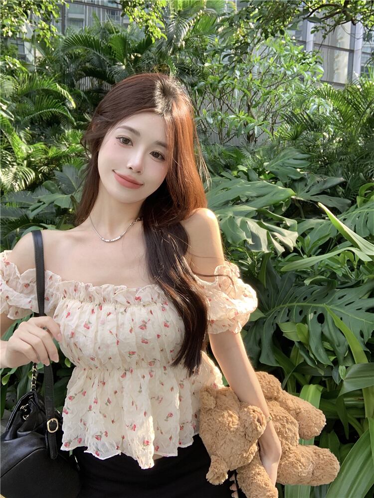 Sweet and spicy style one-shoulder floral chiffon top women's summer 2022 new chic waist short temperament small shirt tide ショート シフォン 大人ガーリー スウィート キュート カジュアル サマー 夏物 花柄 0921931758129181