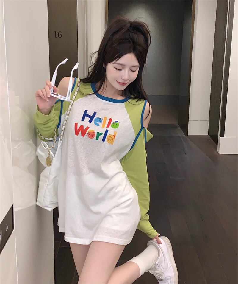 Chic design, hollowed-out contrast printing, long-sleeved T-shirt, women's summer 2022 new air-conditioning shirt, loose top, trendy ロング サマー 夏物 Tシャツ 0921927047563508