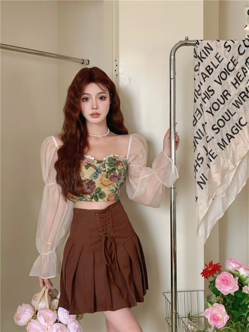 French retro oil painting floral top women's summer 2022 new mesh trumpet sleeve slim short shirt tide ショート レトロ サマー 夏物 メッシュ 花柄 スリム 0921994377155903