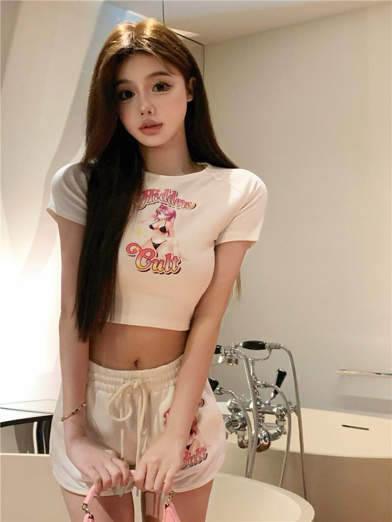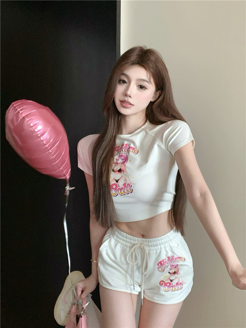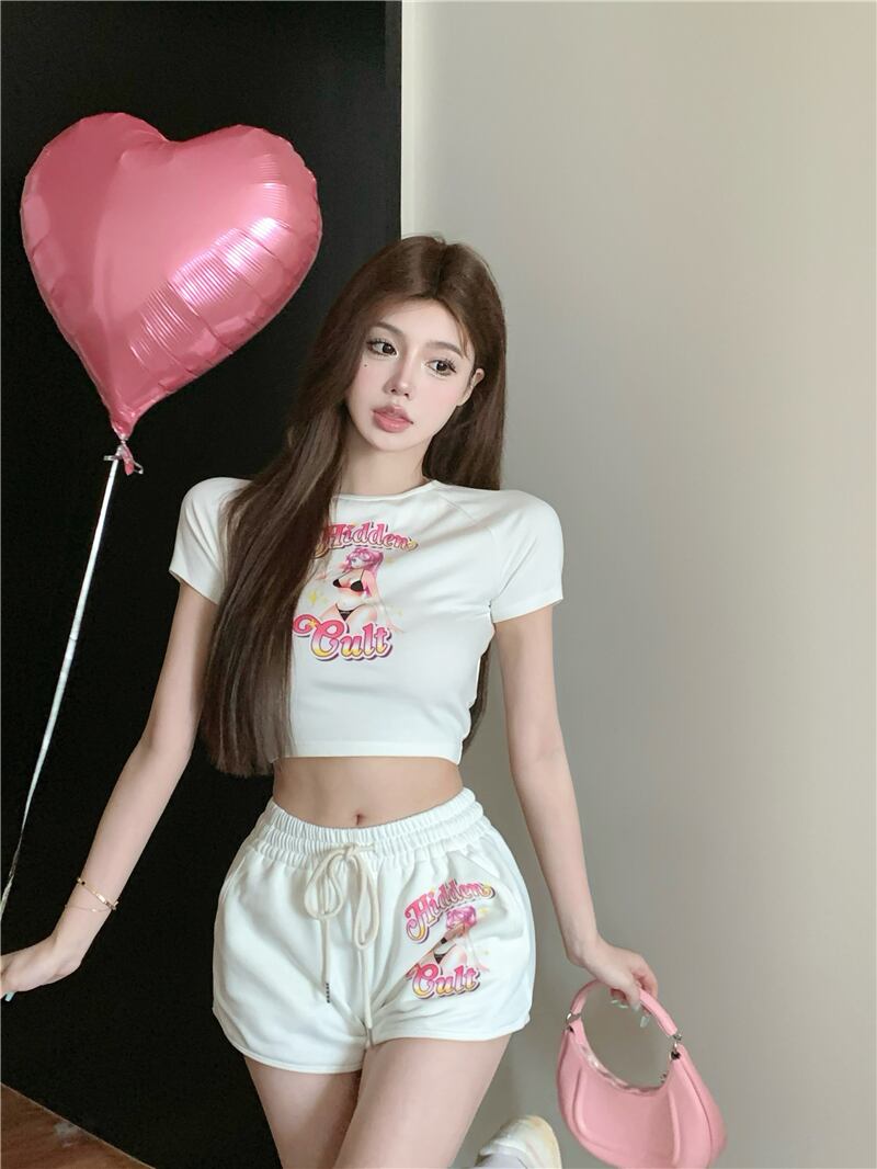 Pure desire white fashion suit female summer 2022 new temperament printed short-sleeved T-shirt drawstring shorts two-piece set ホワイト プリント サマー 夏物 ショーツ ブルマー Tシャツ 0921934353093919