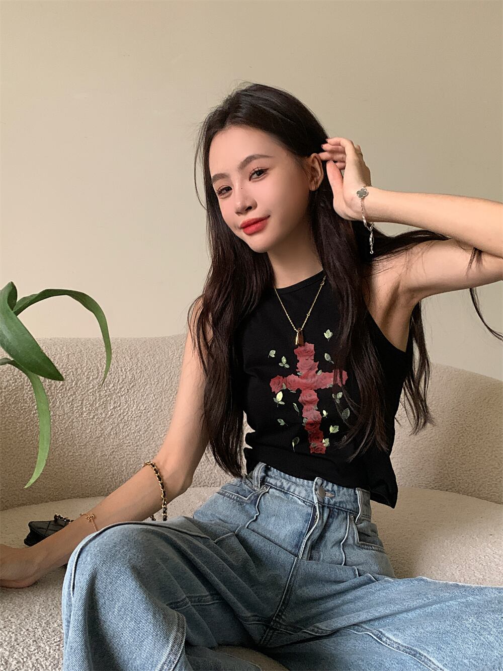 sense rose print black sleeveless vest women's summer 2022 new version slim short top ショート ブラック サマー 夏物 ノースリーブ スリム 0921963451440867