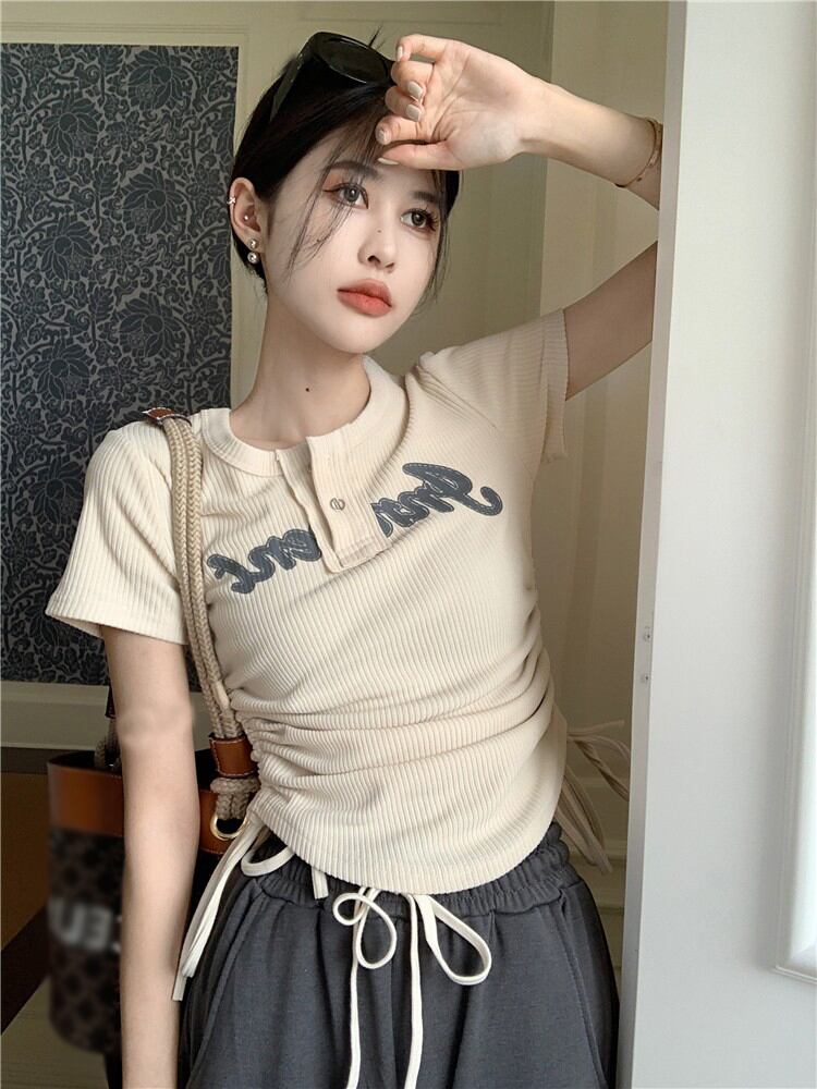 Letter knitted short-sleeved t-shirt women's summer 2022 new version design sense drawstring all-match self-cultivation pure desire top サマー 夏物 Tシャツ ピュア 0921924583736587