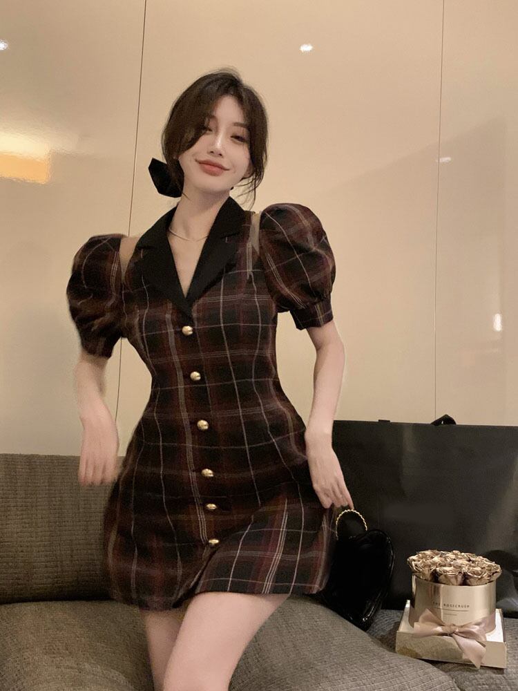 French retro hollow lattice puff sleeve dress women's summer 2022 new temperament sweet waist A-line skirt レトロ 大人ガーリー スウィート キュート カジュアル サマー 夏物 スカート Aライン 0921946199871834