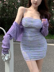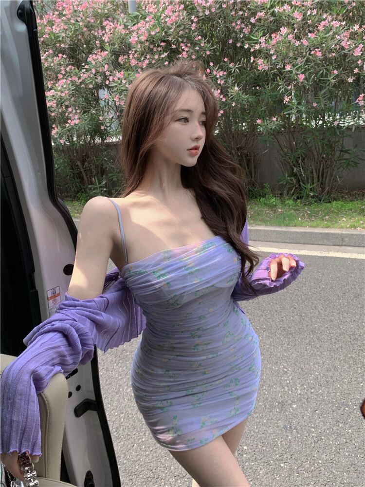 Gentle wind purple floral suspender dress female summer 2022 new pleated waist temperament slim hip skirt プリーツ サマー 夏物 花柄 スリムヒップ スカート スリム パープル 0921941158301908
