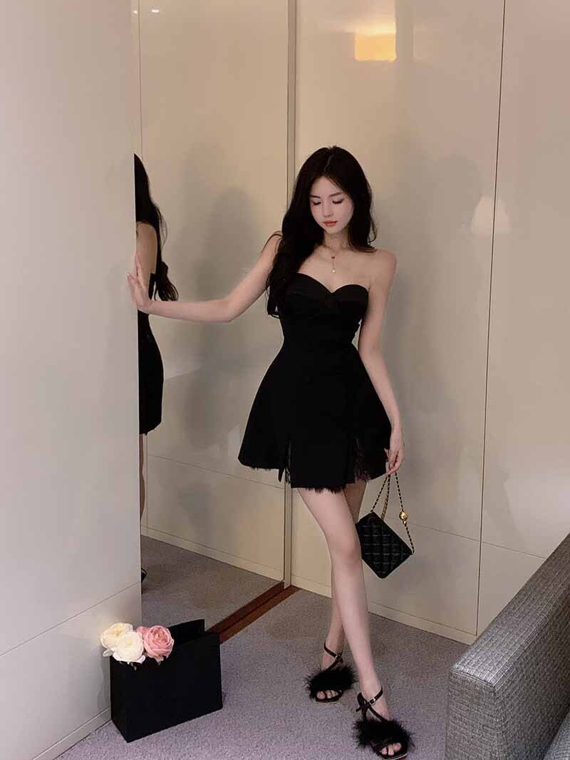 French niche lace stitching black tube top dress women's summer 2022 new temperament waist A-line skirt ブラック レース サマー 夏物 スカート Aライン ステッチ 0921919609947303