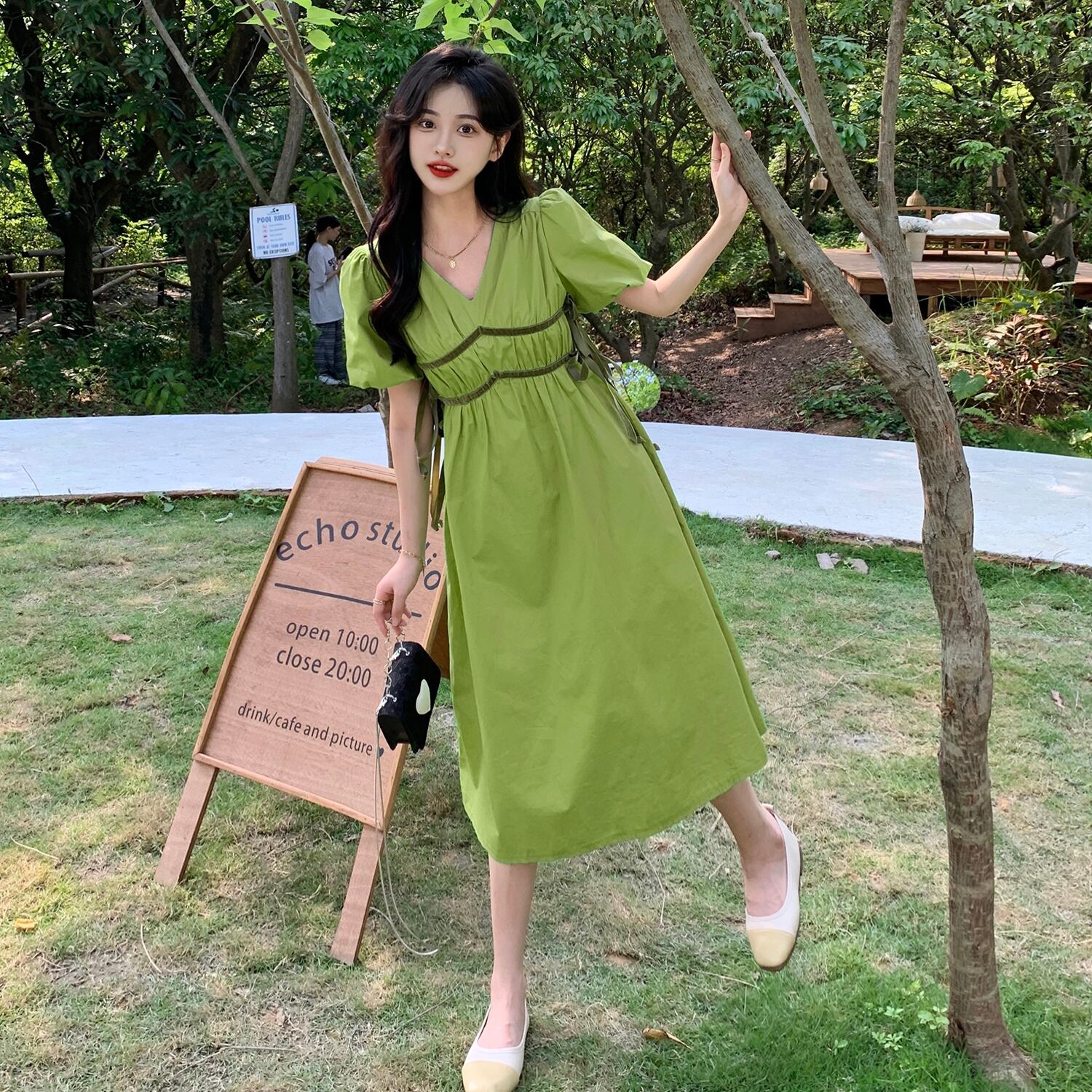 French V-neck pleated green puff sleeve dress women's summer 2022 new temperament mid-length waist skirt プリーツ サマー 夏物 スカート Vネック グリーン 0921983805131761