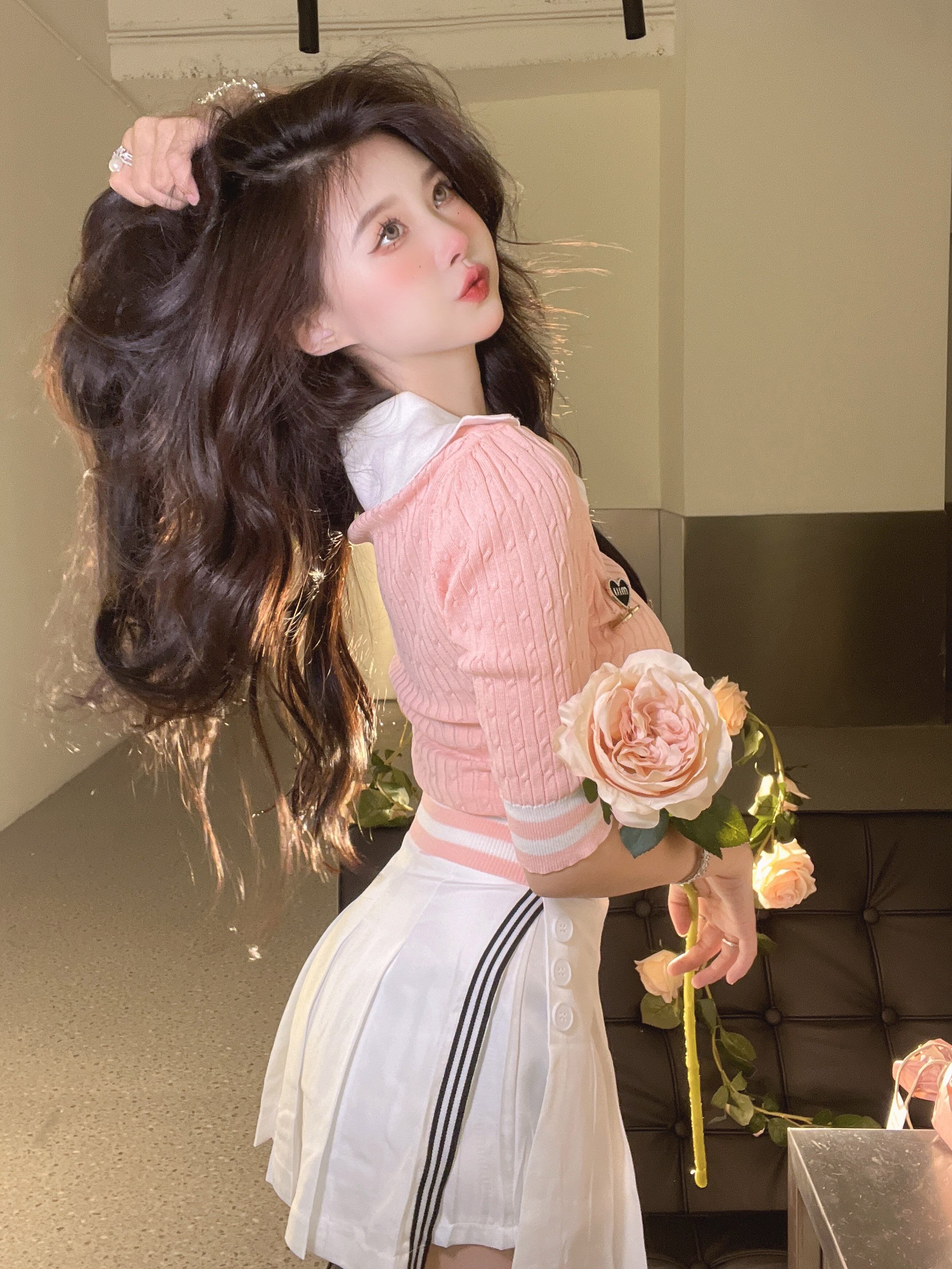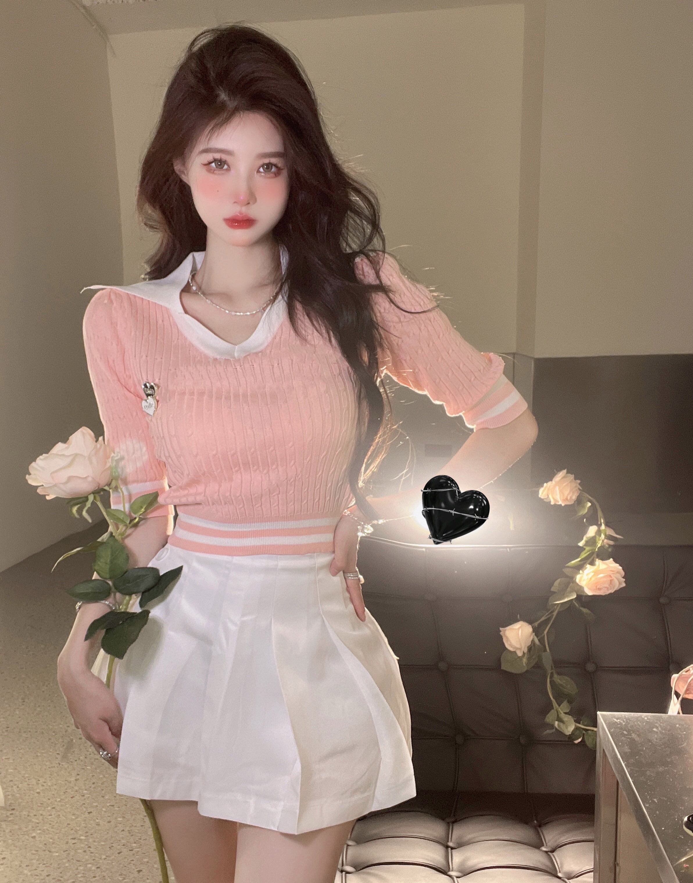 Chic brooch color-blocking short-sleeved t-shirt women's summer 2022 new sweet and spicy style lapel slim knitted short top ショート ブローチ 大人ガーリー スウィート キュート カジュアル サマー 夏物 スリム Tシャツ 0921946065274702