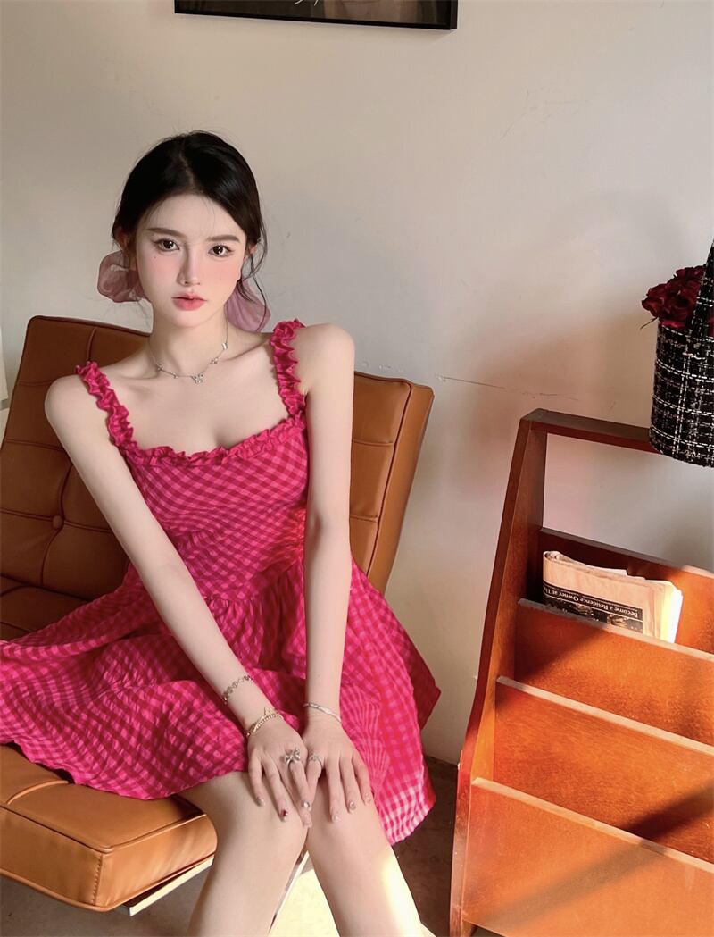 Sweet fungus edge plaid suspender dress women's summer 2022 new pure desire wind backless waist A-line skirt trend 大人ガーリー スウィート キュート カジュアル サマー 夏物 スカート Aライン ピュア 0921946329141950