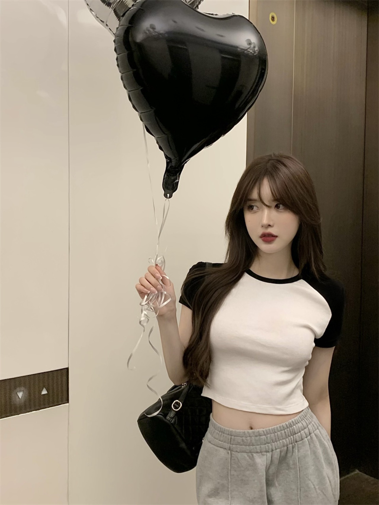 Color-blocking short-sleeved T-shirt women's summer 2022 new design sense niche slim slimming bm style short crop top ショート サマー 夏物 スリム Tシャツ 0921942898071134