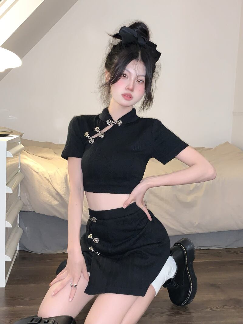 Hot retro buckle black suit female summer 2022 new fashion knitted top skirt two-piece tide ブラック レトロ サマー 夏物 スカート 0921938718712063