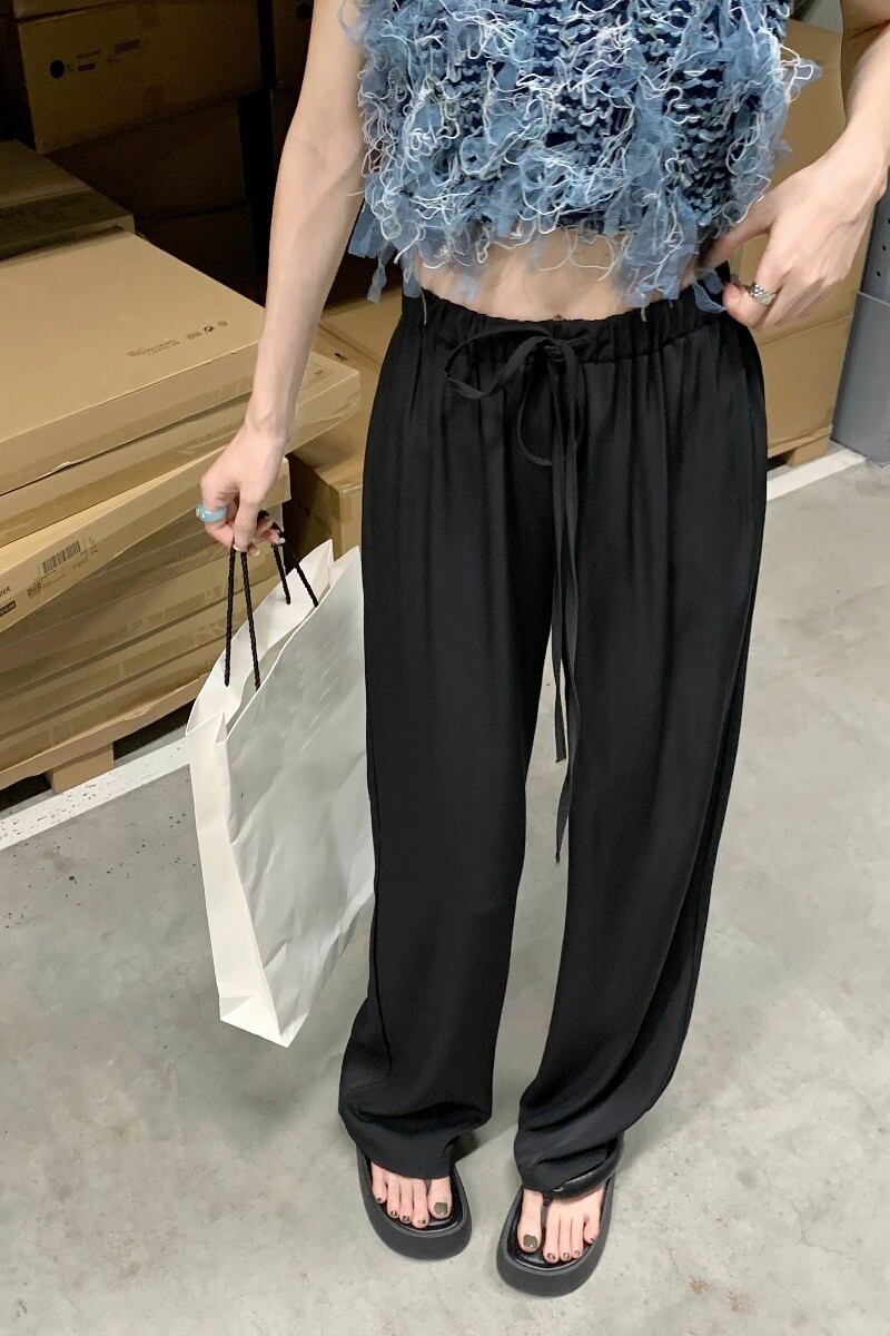 Lazy style black wide-leg pants women's high waist drape summer 2022 new thin lace-up loose casual pants ハイウェスト ブラック レース カジュアル サマー 夏物 レースアップ 0921979406160271