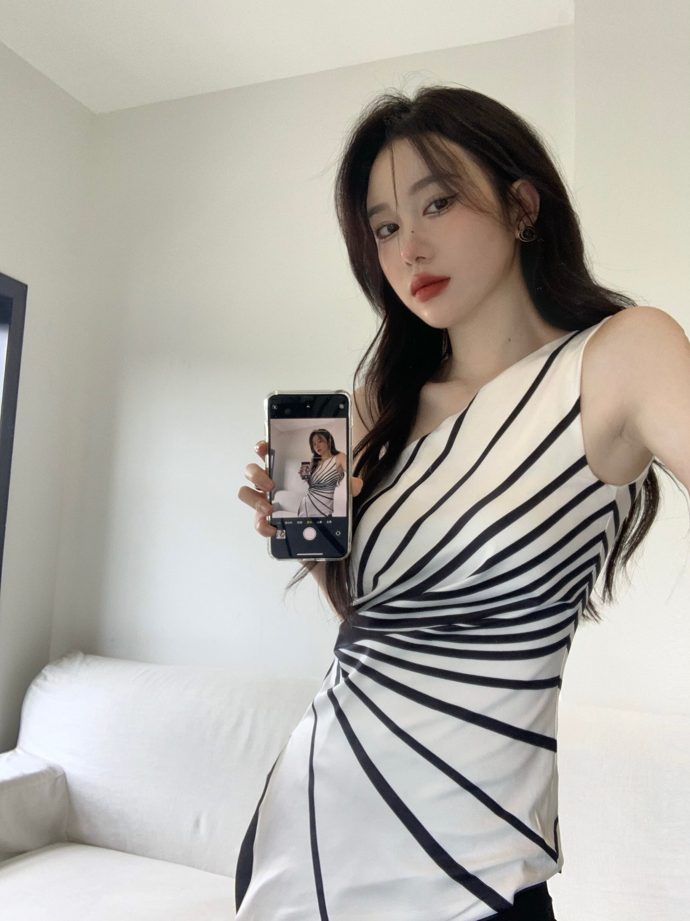 Sexy line printing slanted shoulder sleeveless vest women's outer wear summer 2022 new chic and slim irregular top サマー 夏物 ノースリーブ スリム 0921935067215610