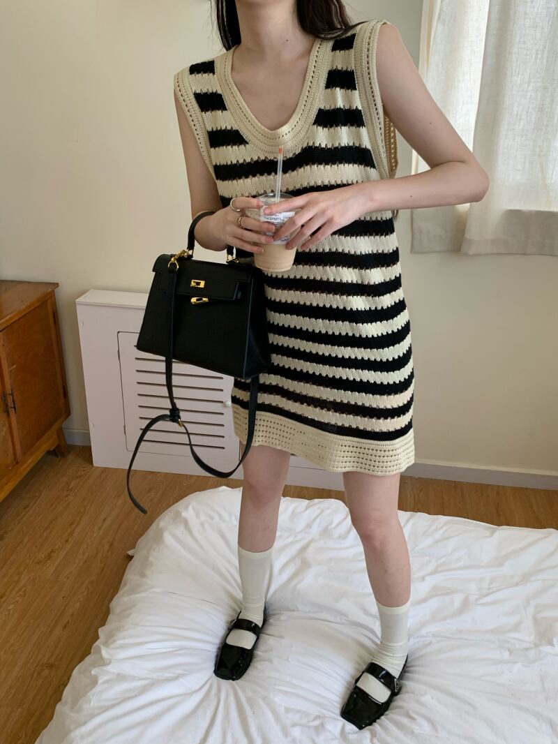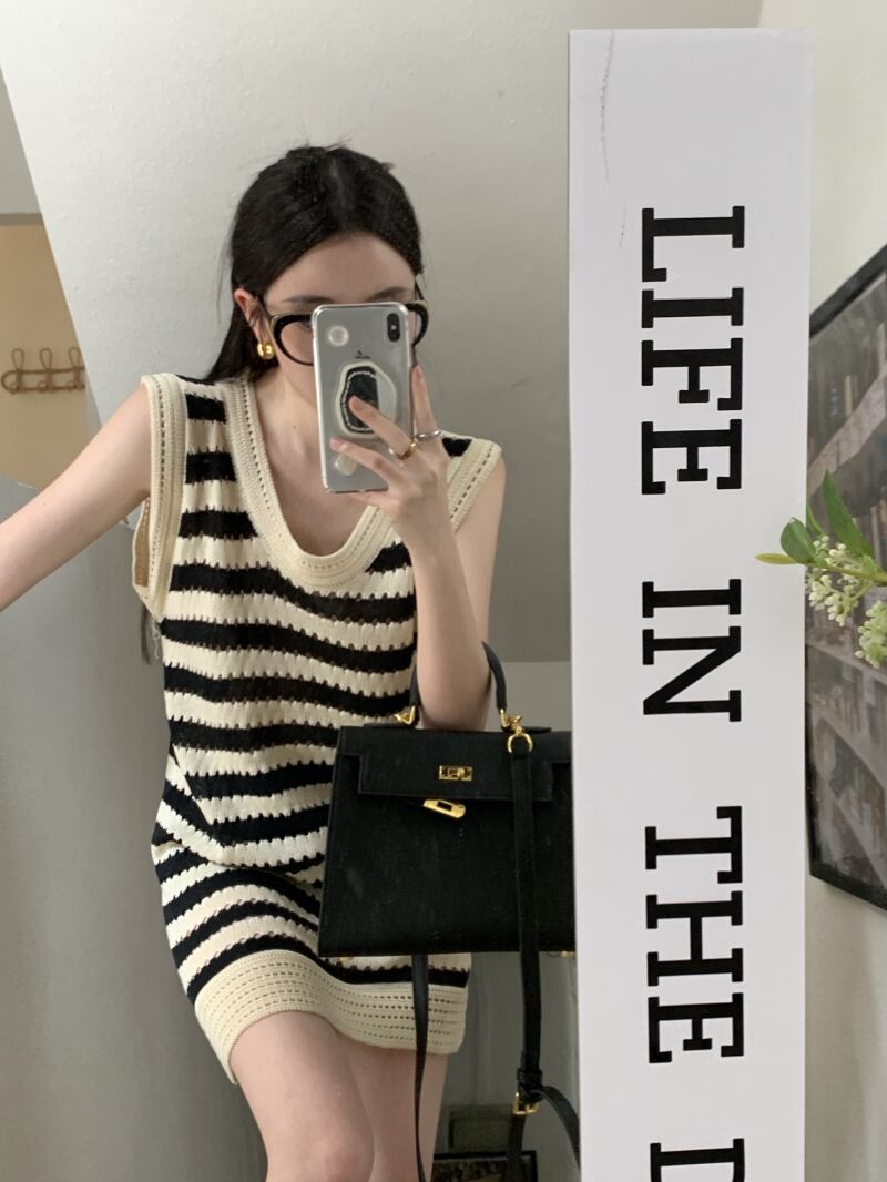Striped knitted sleeveless vest dress women's summer 2022 new version of the lazy style loose and thin a-line skirt サマー 夏物 ノースリーブ スカート Aライン ストライプ 0921940046663306