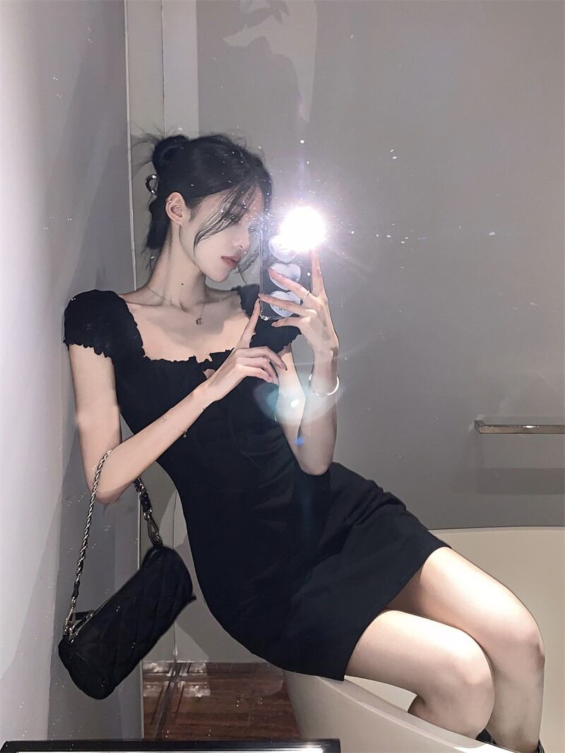Hot black puff sleeve dress female summer 2022 new square neck tie hollow waist waist slimming hip skirt ブラック サマー 夏物 スカート スクウェア 0921977782738498