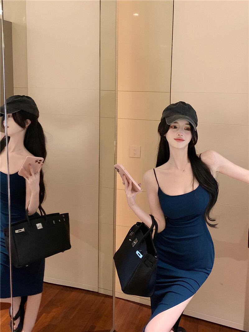 Blue sexy split suspender dress women's summer 2022 new temperament waist mid-length slim bag hip skirt ブルー サマー 夏物 スカート スリム 0921916567779353