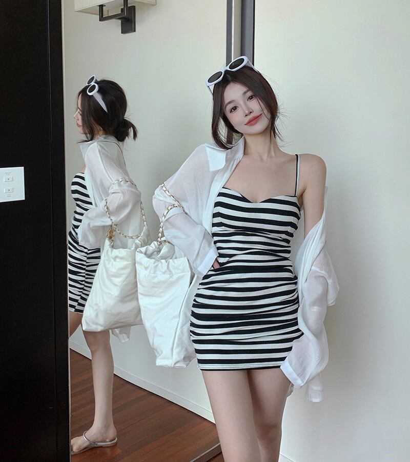 Hot temperament exposed collarbone striped suspender dress female summer 2022 new sexy tight waist bag hip skirt サマー 夏物 スカート ストライプ 0921921463712947