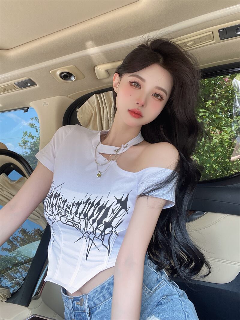 Hot off-the-shoulder short-sleeved T-shirt women's summer 2022 new design sense printing slim fit short top ins tide ショート サマー 夏物 スリム Tシャツ 0921957200523129