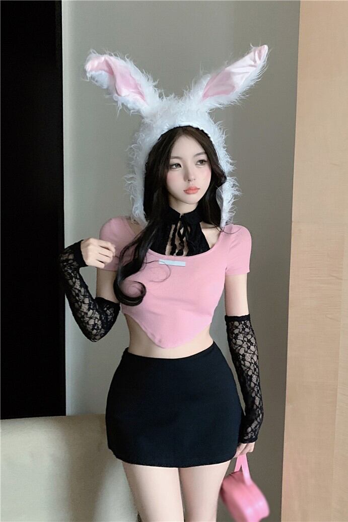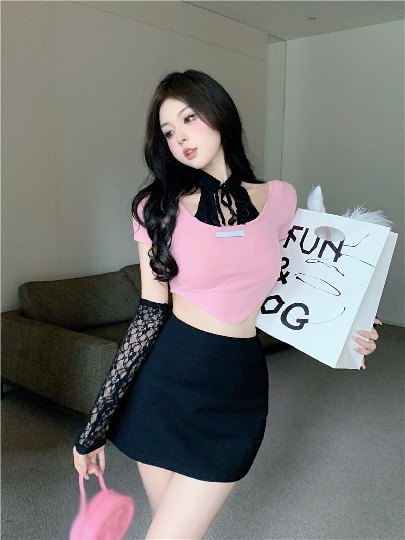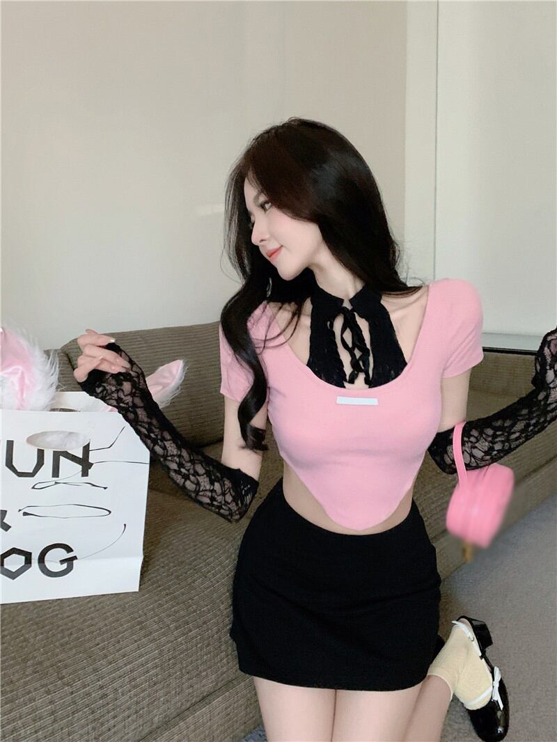 Hot off-the-shoulder lace stitching short-sleeved T-shirt women's summer 2022 new slim fit and thin irregular short top ショート レース サマー 夏物 スリム Tシャツ ステッチ 0921980354904374