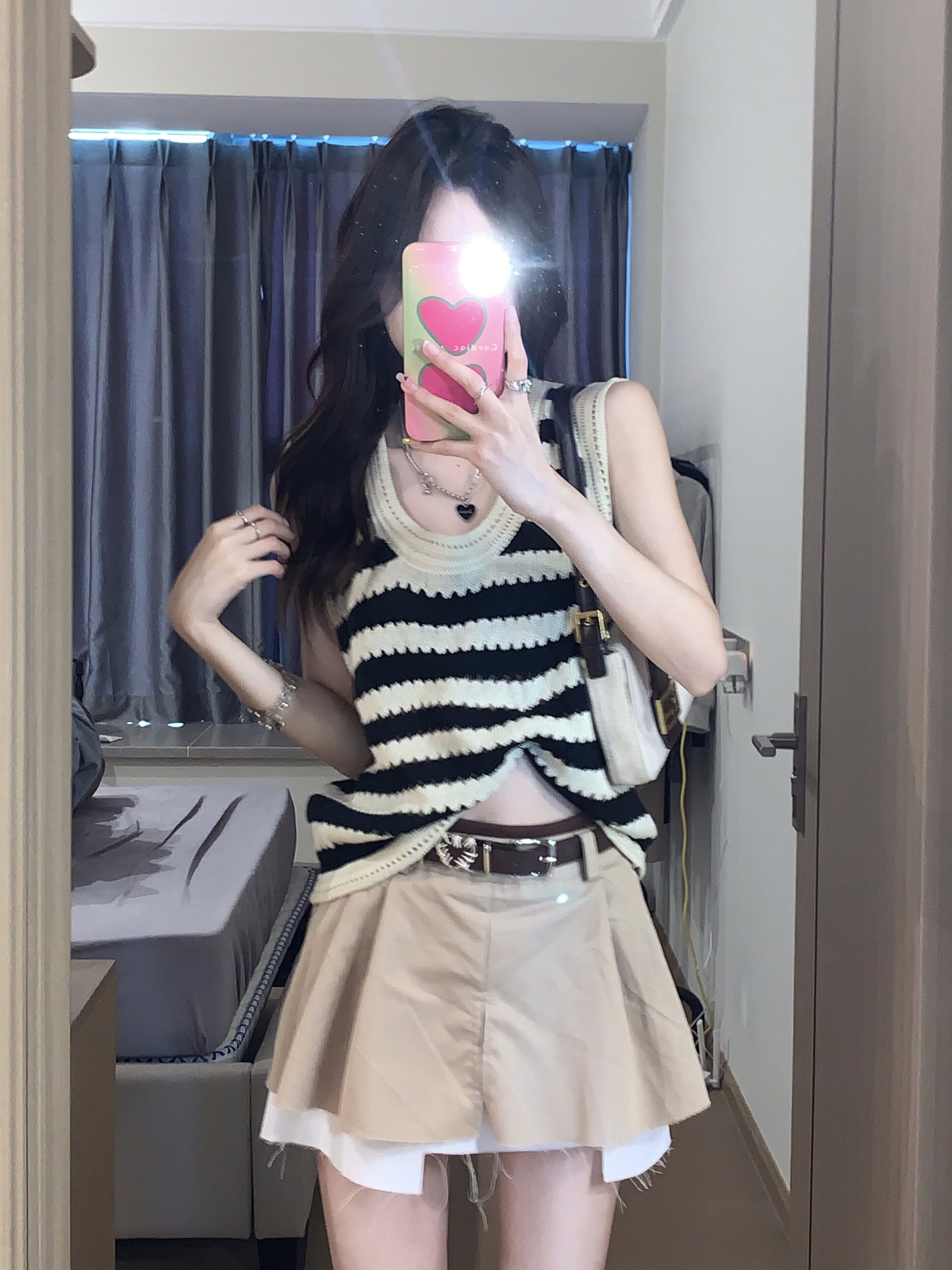 Hot hollowed out contrast color striped sleeveless knitted vest women's outer wear summer 2022 new temperament thin top trendy サマー 夏物 ノースリーブ ストライプ 0921980324318489