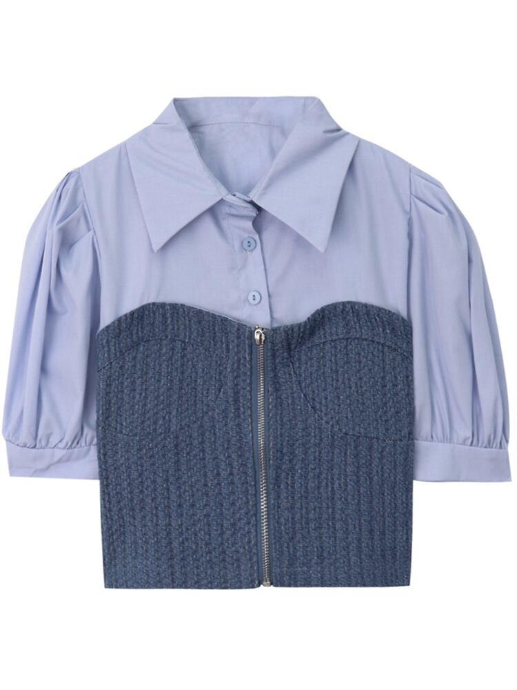 sense puff sleeves stitching denim shirt women's summer 2022 new style temperament polo collar short top ショート サマー 夏物 ステッチ 0921969845825373