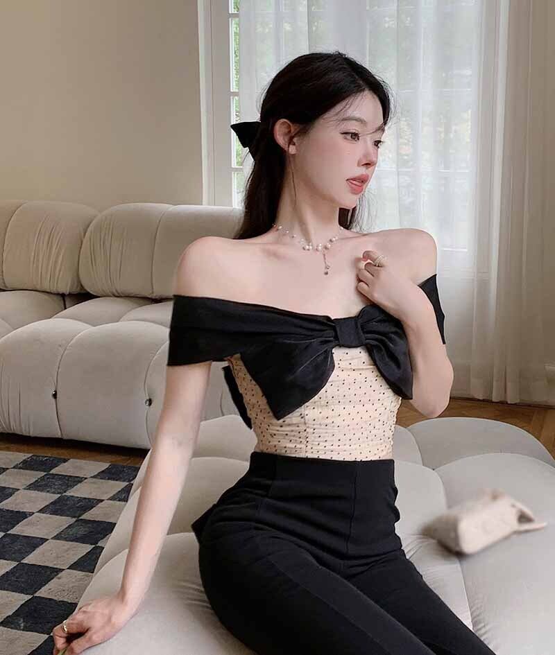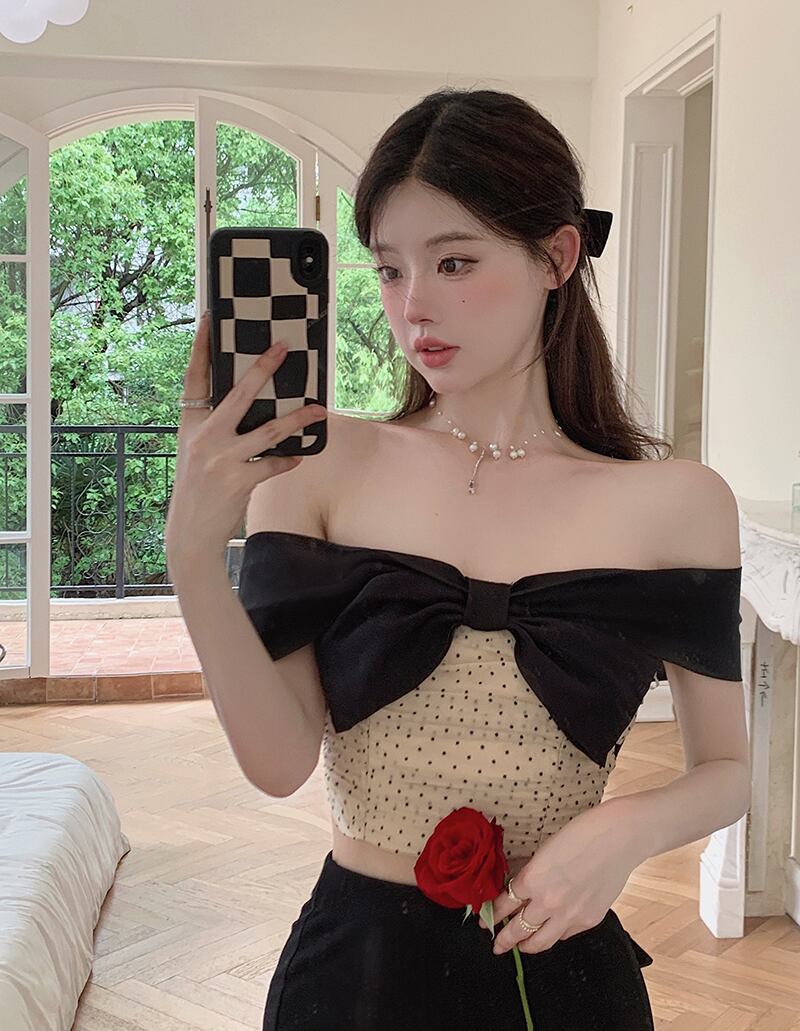French bow short-sleeved polka dot shirt women's summer 2022 new temperament one-shoulder slim short top trendy ショート リボン サマー 夏物 スリム 0921994636585002