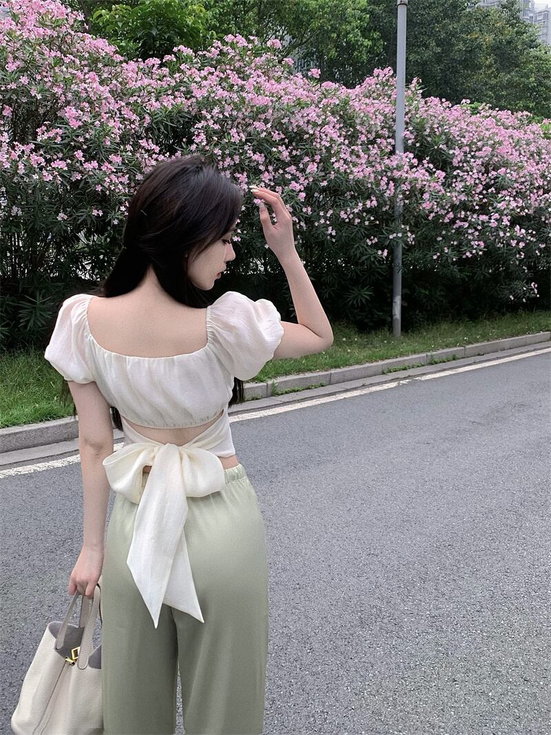 Gentle temperament square neck bandage puff sleeve shirt women's summer 2022 new chic slim short top trend ショート サマー 夏物 スリム スクウェア 0921975130126692