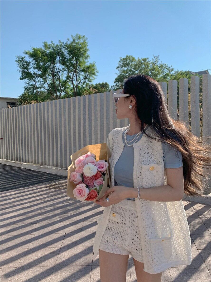 -quality small fragrance suit women's summer 2022 new crochet vest coat high waist shorts temperament two-piece suit ハイウェスト サマー 夏物 ショーツ ブルマー 0921962340289201