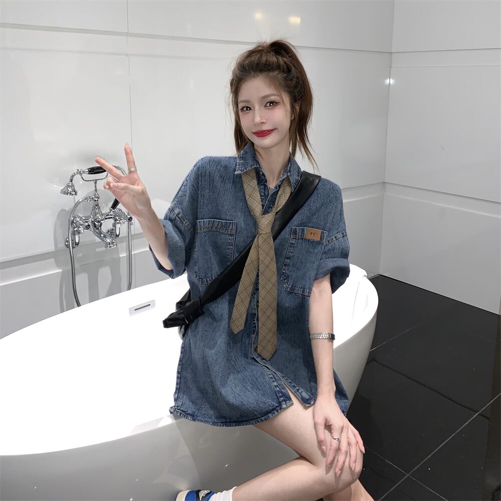 sense niche labeling loose denim shirt women's summer 2022 new retro fashion mid-length top trendy レトロ サマー 夏物 092191617994934