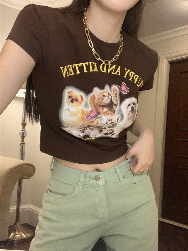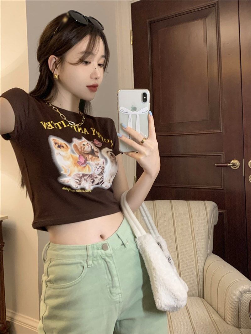 sense animal letter printing short-sleeved T-shirt women's summer 2022 new slim fit and thin short top ショート サマー 夏物 スリム Tシャツ 0921914515852013
