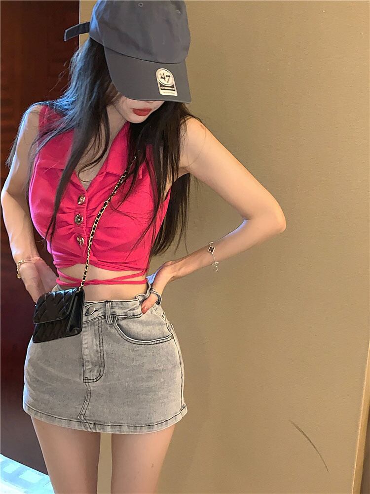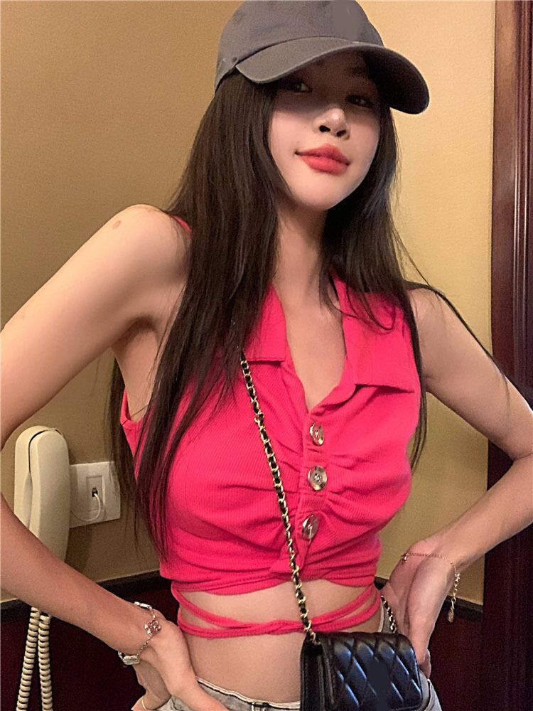 Rose red polo collar vest women's inner wear summer 2022 new slim straps short sleeveless top ショート レッド 半袖 ハーフスリーブ サマー 夏物 ノースリーブ スリム 0921998314976925