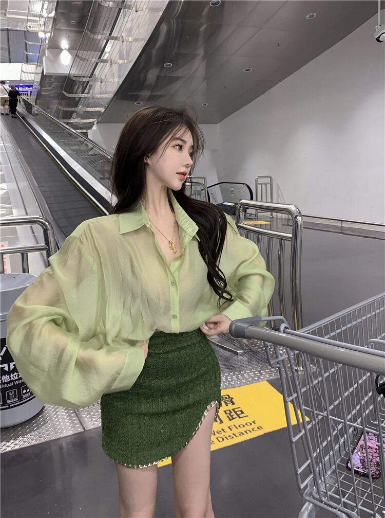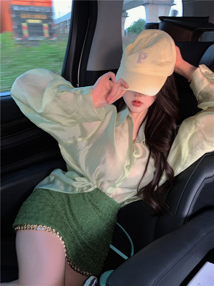 sense green sunscreen long-sleeved satin shirt women's thin summer 2022 new style fashion loose top ロング サマー 夏物 サテン グリーン 0921936574434375