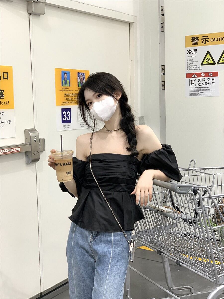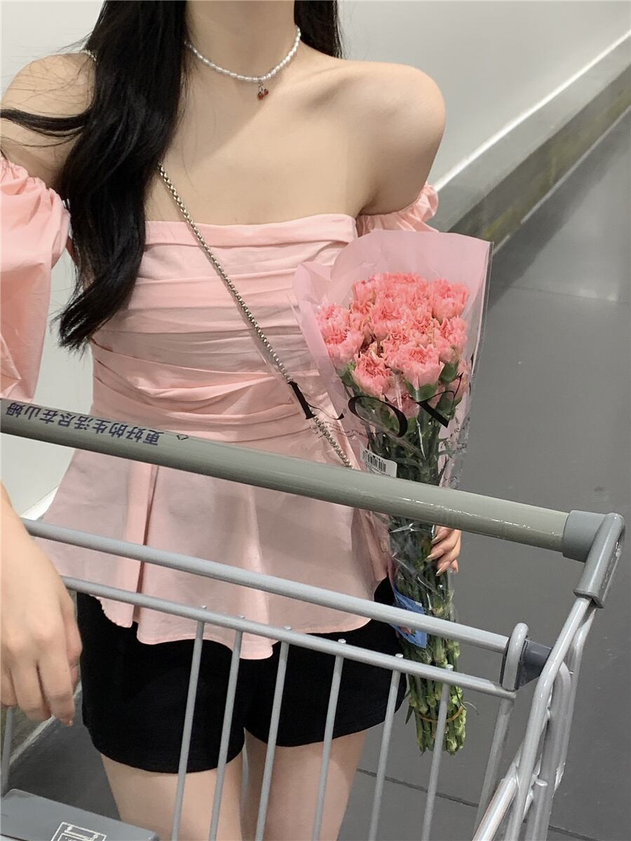 Pink puff sleeve one-shoulder shirt women's summer 2022 new design sense niche pleated slim short top ショート ピンク プリーツ サマー 夏物 スリム 092194083005071