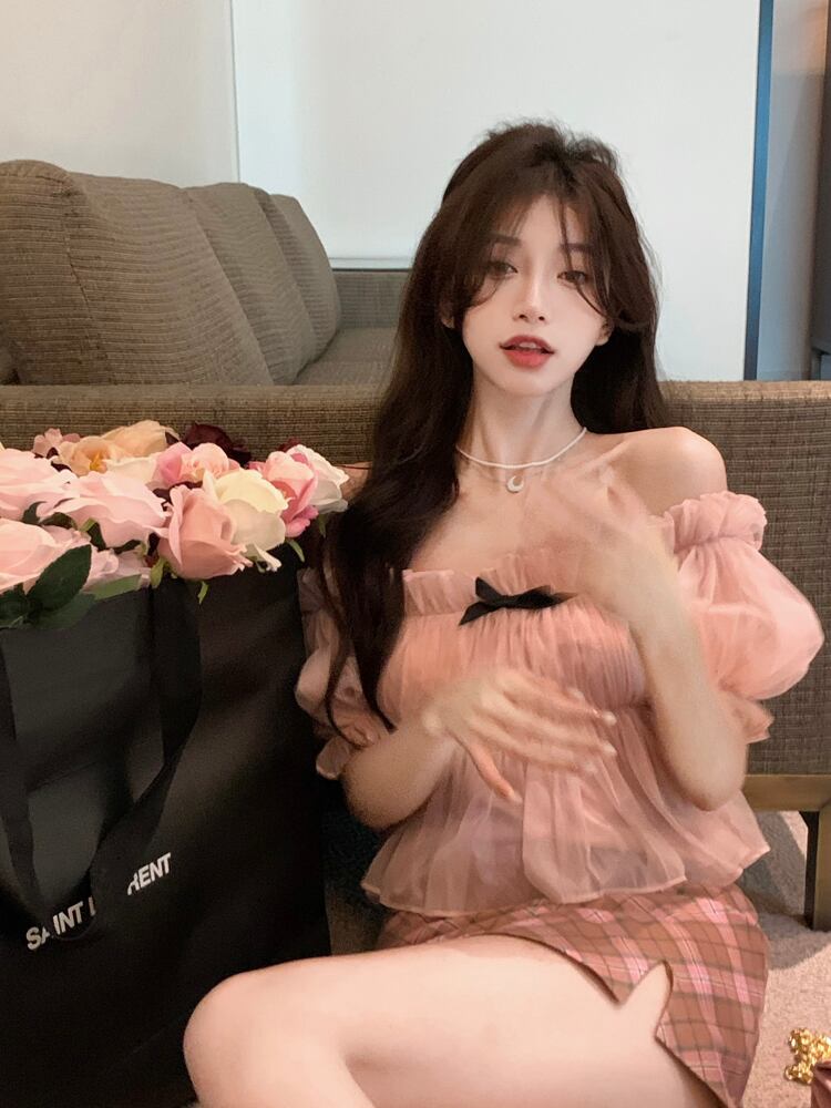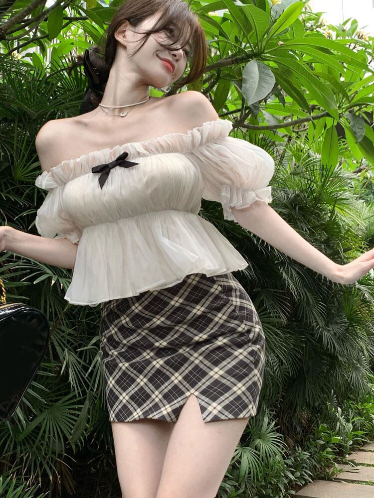 Super fairy net yarn fungus edge one-shoulder puff sleeve shirt women's summer 2022 new gentle temperament short top ショート サマー 夏物 0921939391974228