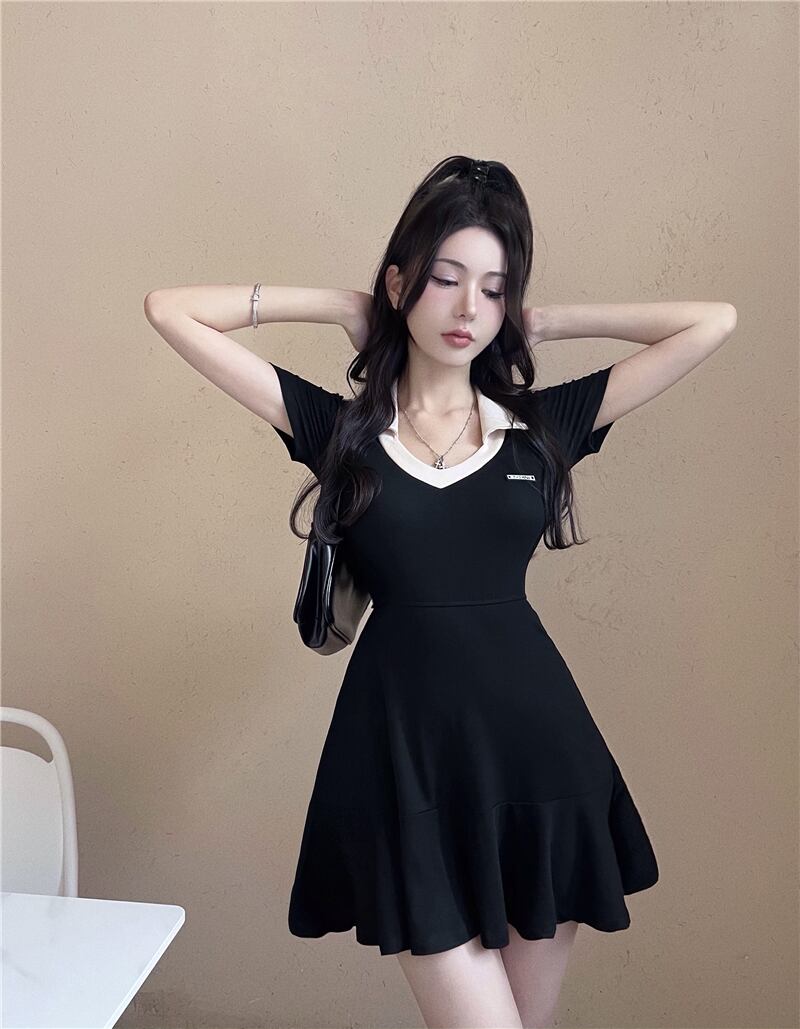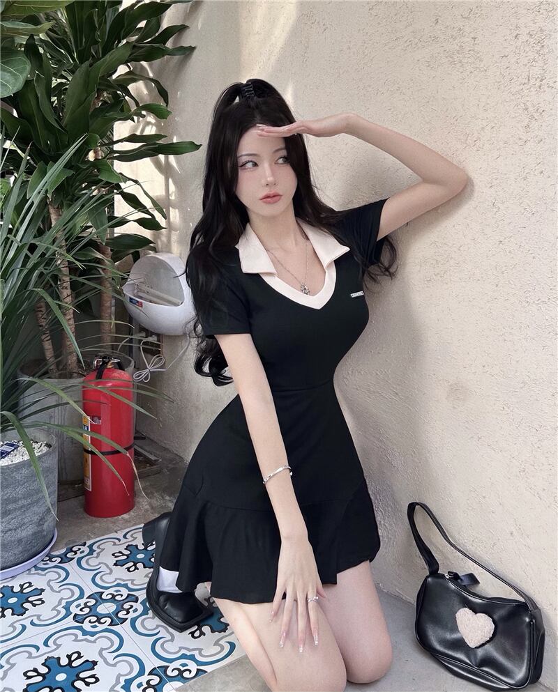 Sweet and spicy style color matching short-sleeved dress women's summer 2022 new net red small man waist and thin A-line skirt レッド 大人ガーリー スウィート キュート カジュアル サマー 夏物 スカート Aライン 0921933239231397
