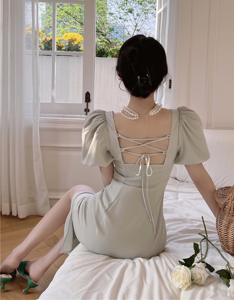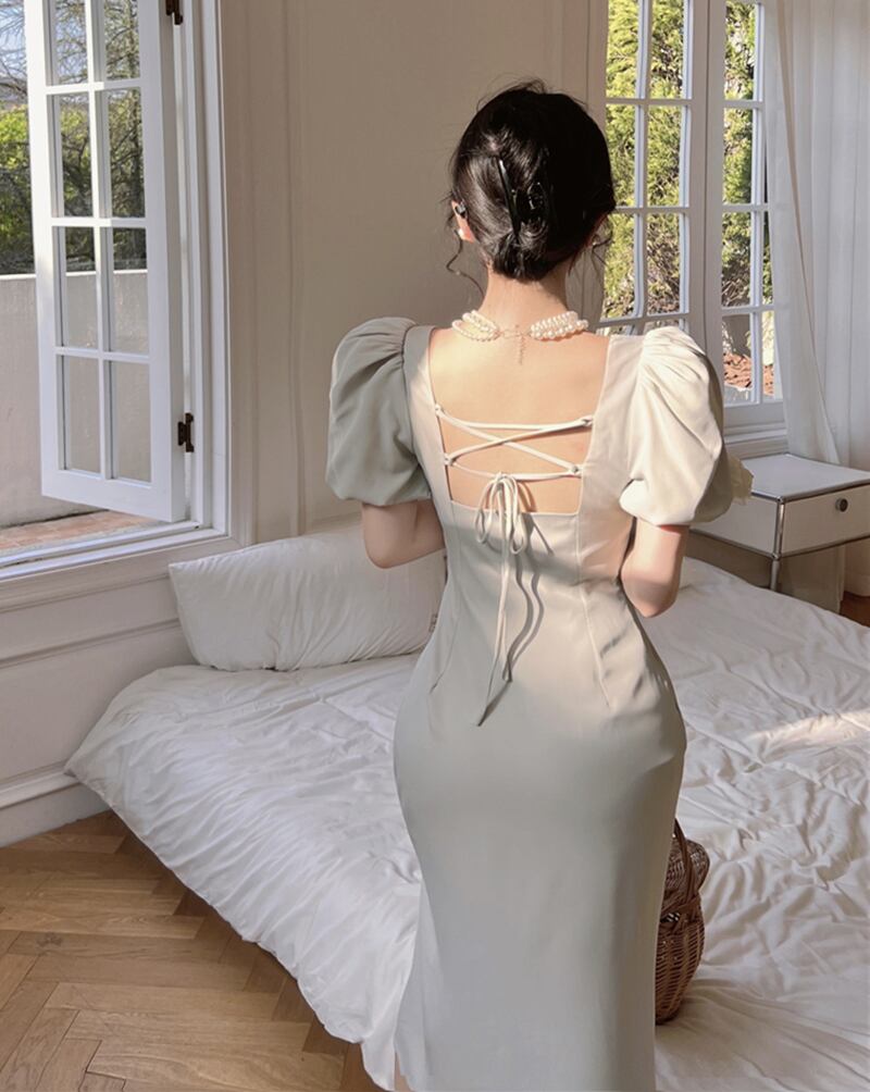 Pure desire wind backless puff sleeve dress women's summer 2022 new square collar waist mid-length split skirt trendy サマー 夏物 スカート スクウェア 0921991450703627