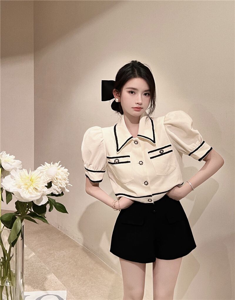 -quality color matching small fragrance short-sleeved shirt women's summer 2022 new chic temperament doll collar short top ショート サマー 夏物 0921990378082977