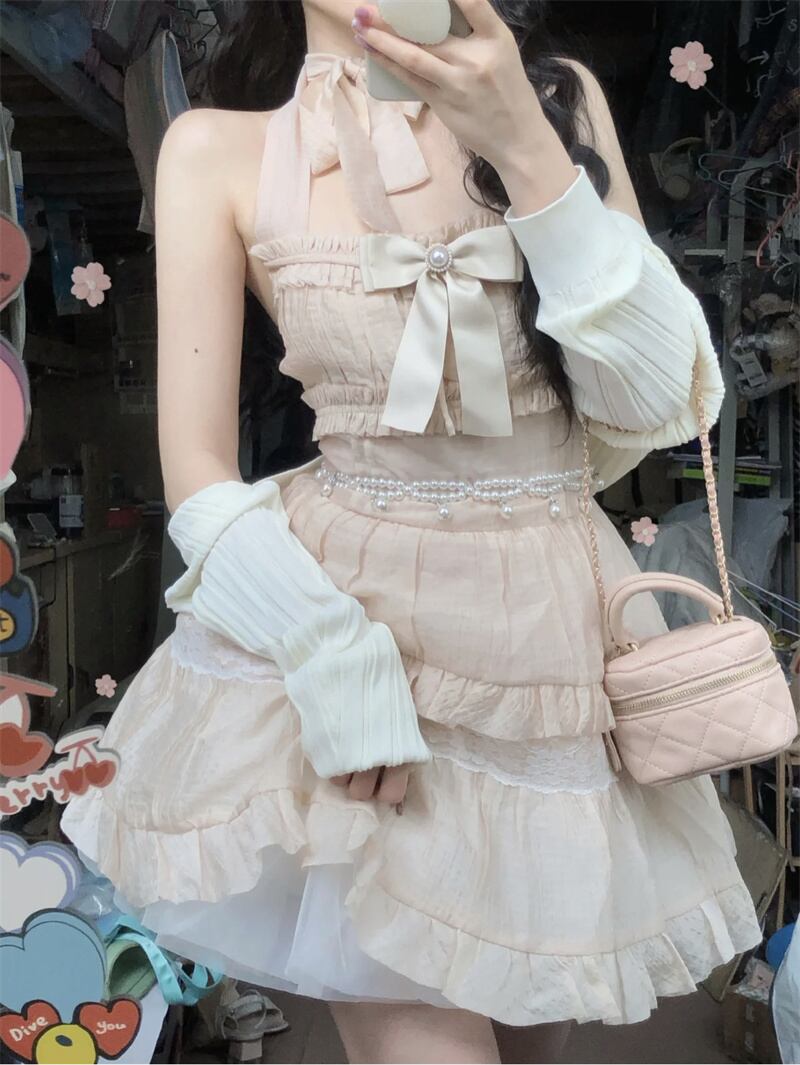 Chic and beautiful bow beaded halter dress women's summer 2022 new style small waist cake short skirt ショート リボン サマー 夏物 スカート 0921940462100141