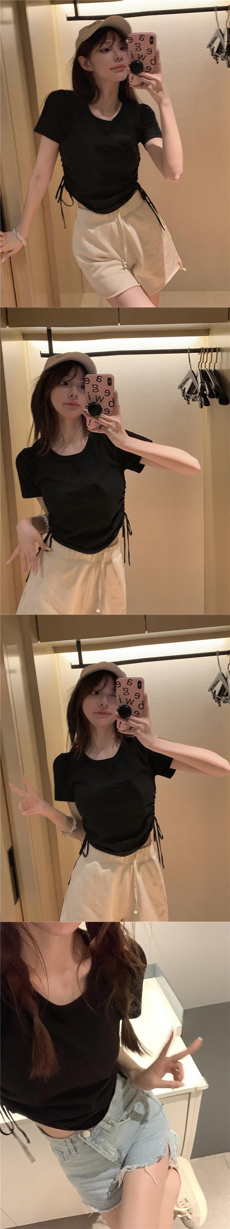 White drawstring short-sleeved T-shirt women's summer 2022 new slim fit and slim design chic short top ins tide ショート ホワイト サマー 夏物 スリム Tシャツ 0921912087208291