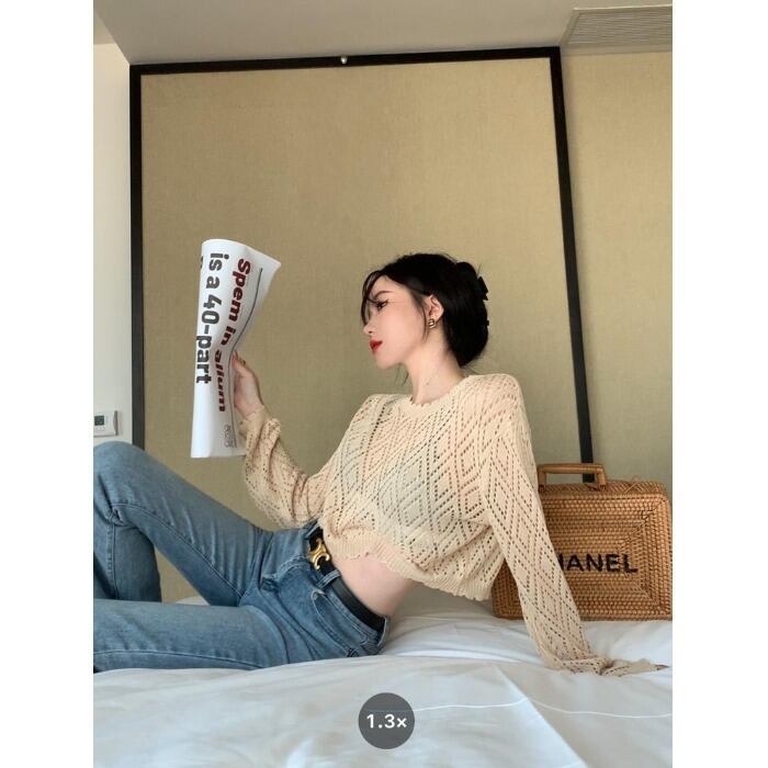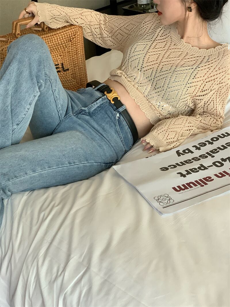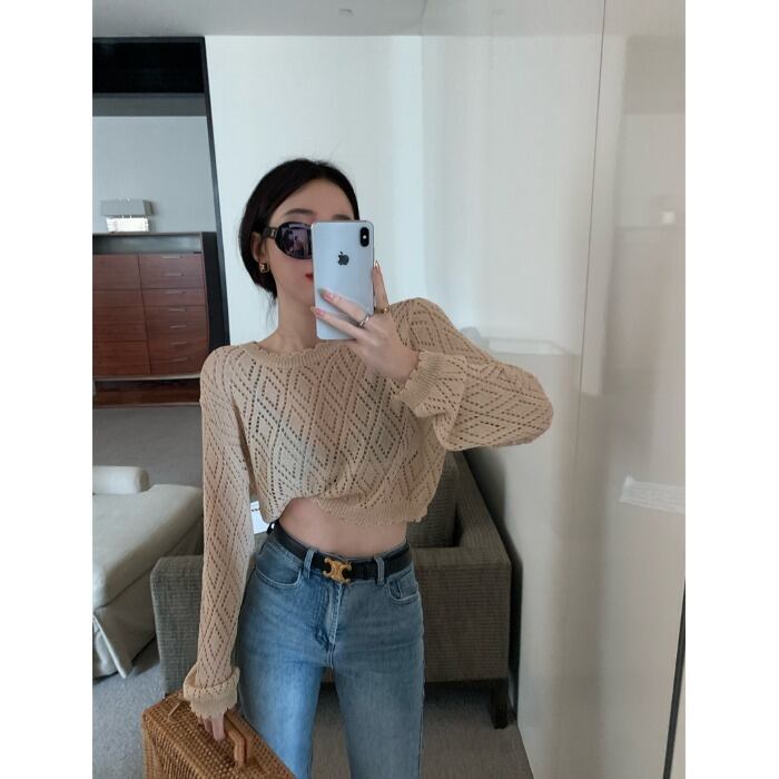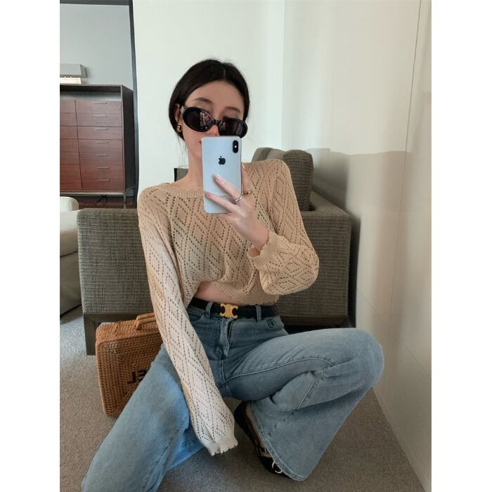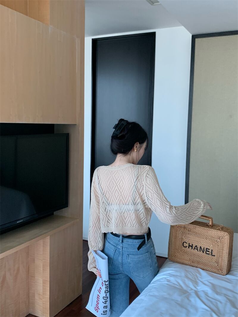 Hot hollow sunscreen blouse long-sleeved knitted sweater women's summer 2022 new chic loose and thin short top ショート ロング ブラウス サマー 夏物 0921972958512720