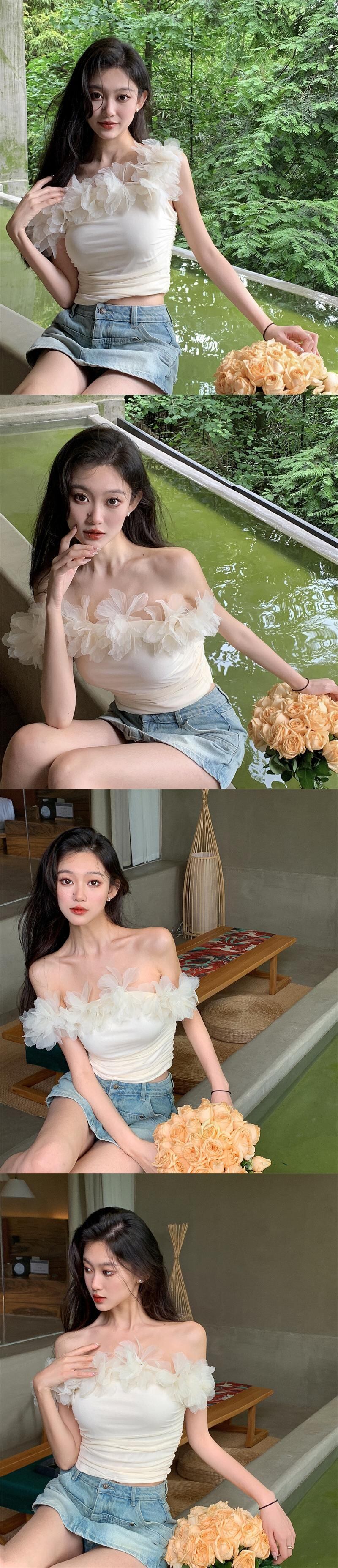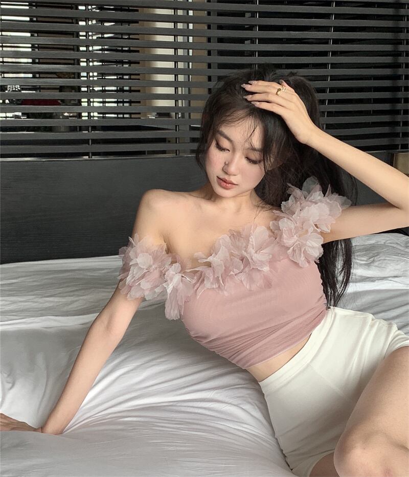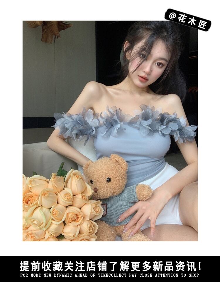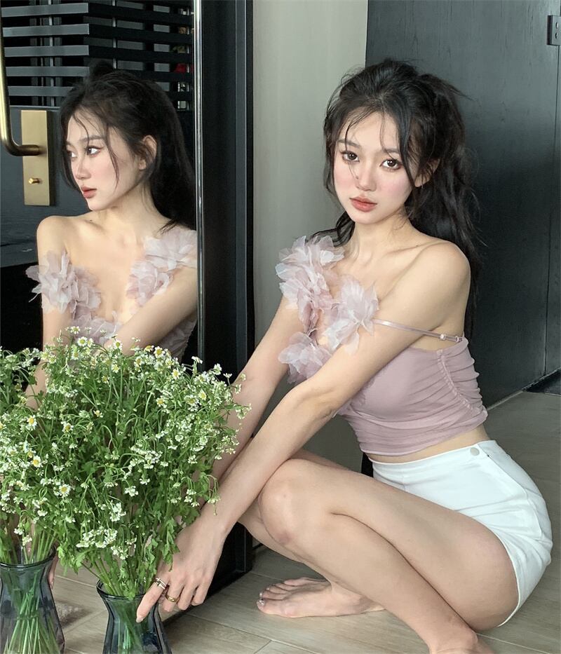 Pure desire chic three-dimensional flower camisole women's summer 2022 new sweet exposed collarbone short top ショート 大人ガーリー スウィート キュート カジュアル サマー 夏物 フラワーデザイン 0921938419799575