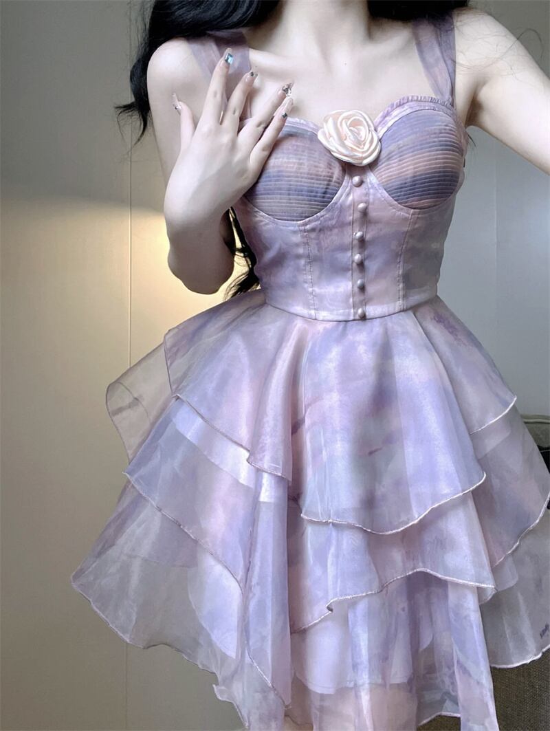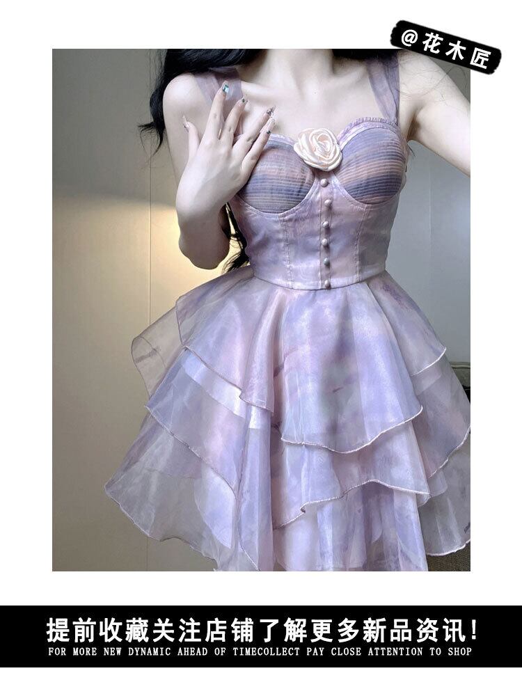 Sweet and Spicy Chic Flower Sling Dress Women's Summer 2022 Sensation Niche Waist Mesh Puff Skirt 大人ガーリー スウィート キュート カジュアル サマー 夏物 メッシュ スカート フラワーデザイン 0921940770544049