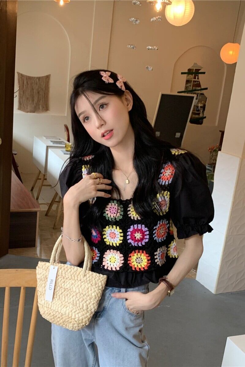 sense hollowed out contrasting color flower puff sleeve shirt women's summer 2022 new chic slim short top trendy ショート サマー 夏物 スリム フラワーデザイン 0921964628603552