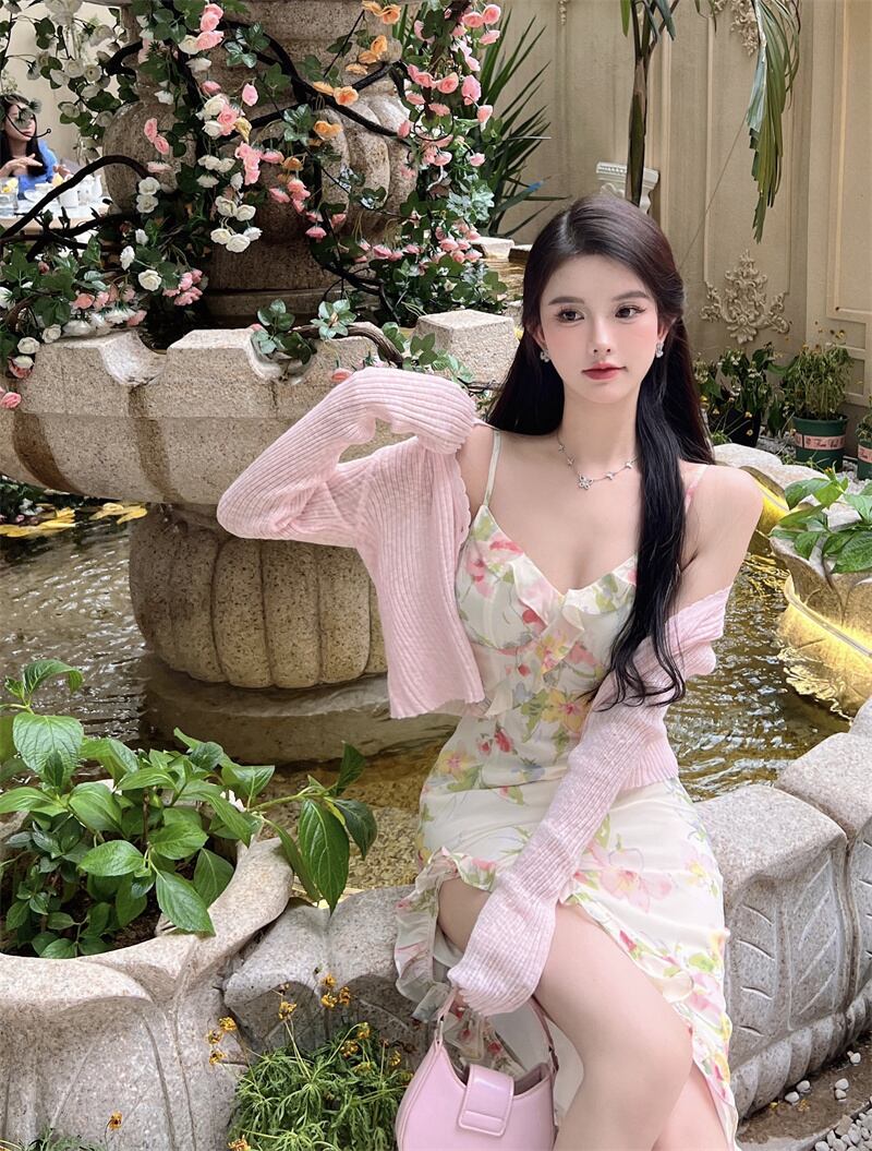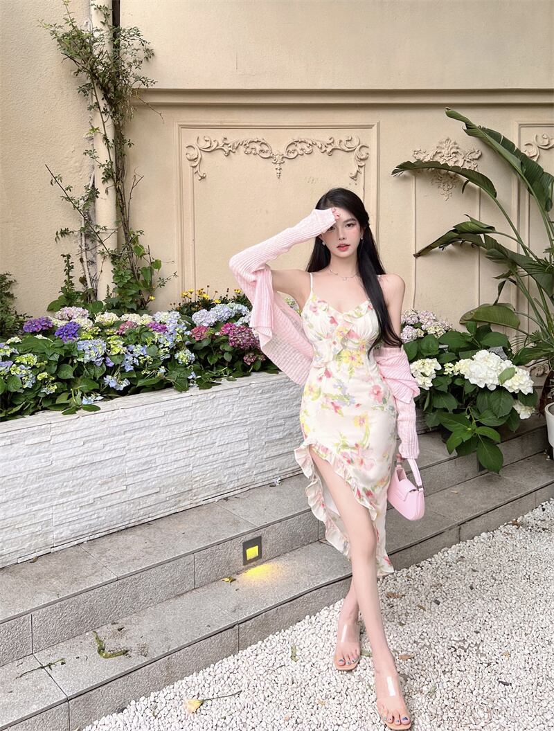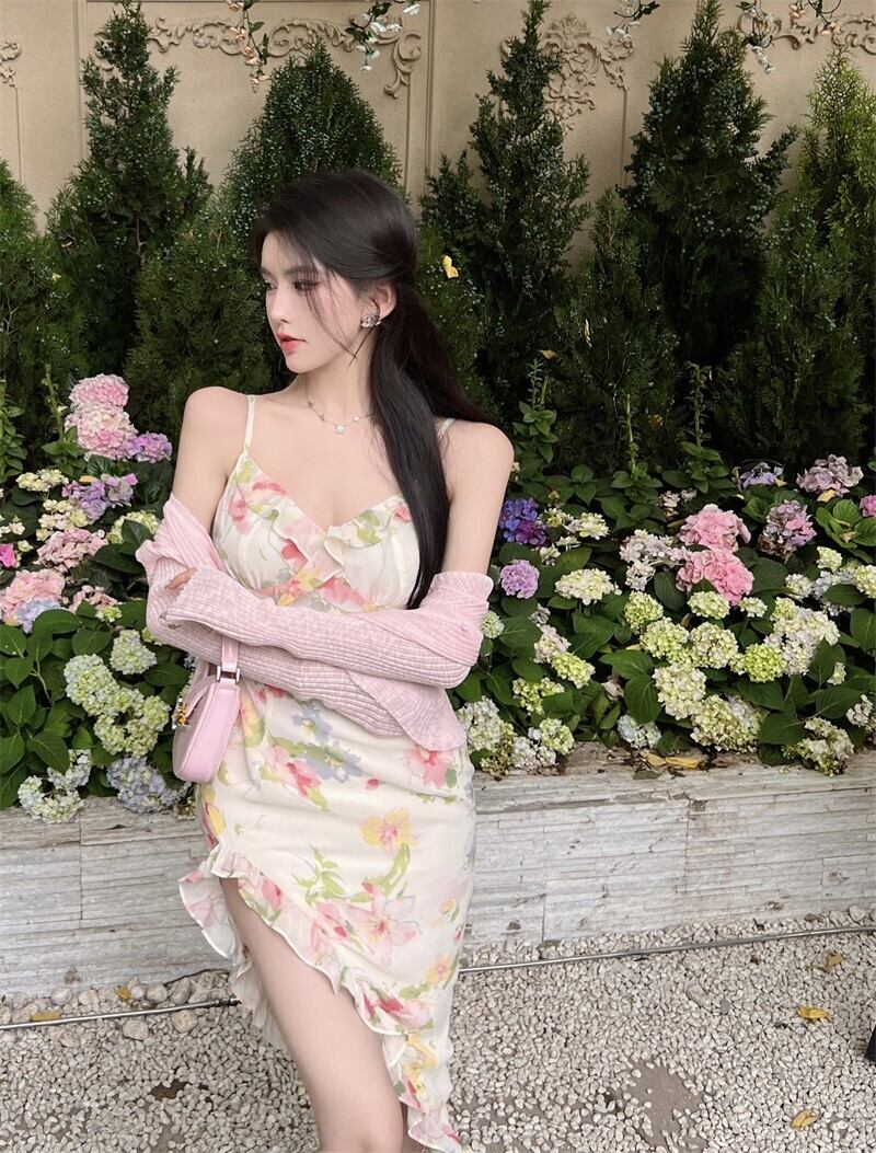 Gentle wind floral suspender dress female summer 2022 new ruffled waist mid-length split fishtail skirt サマー 夏物 花柄 スカート 0921944070400591