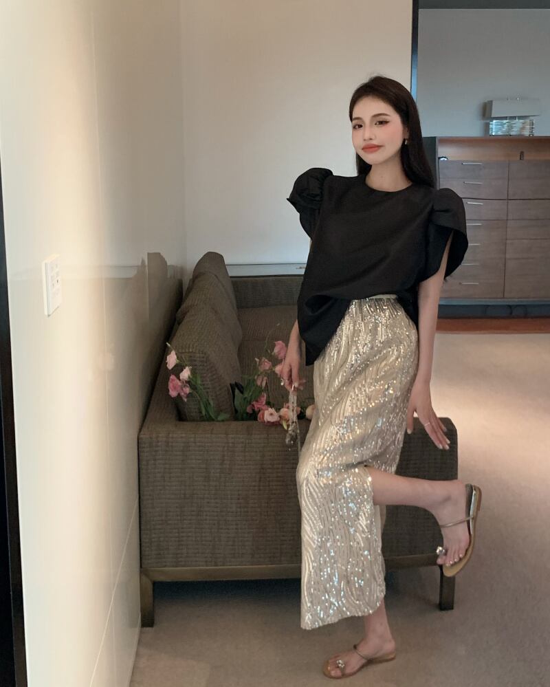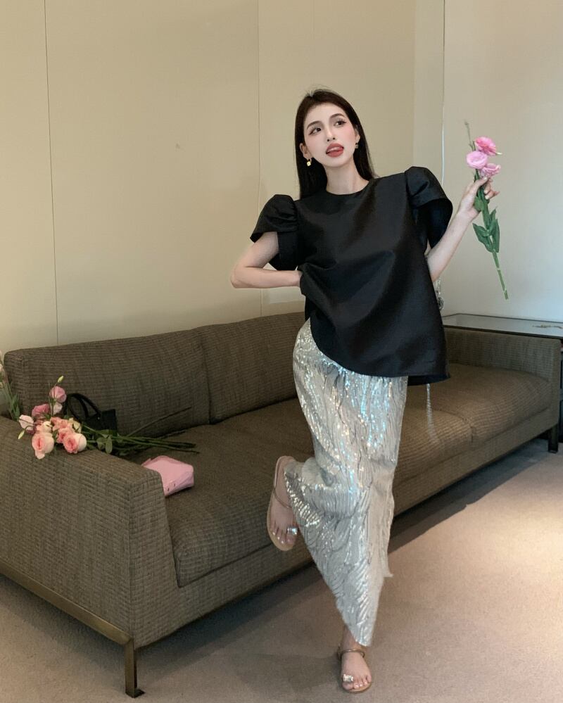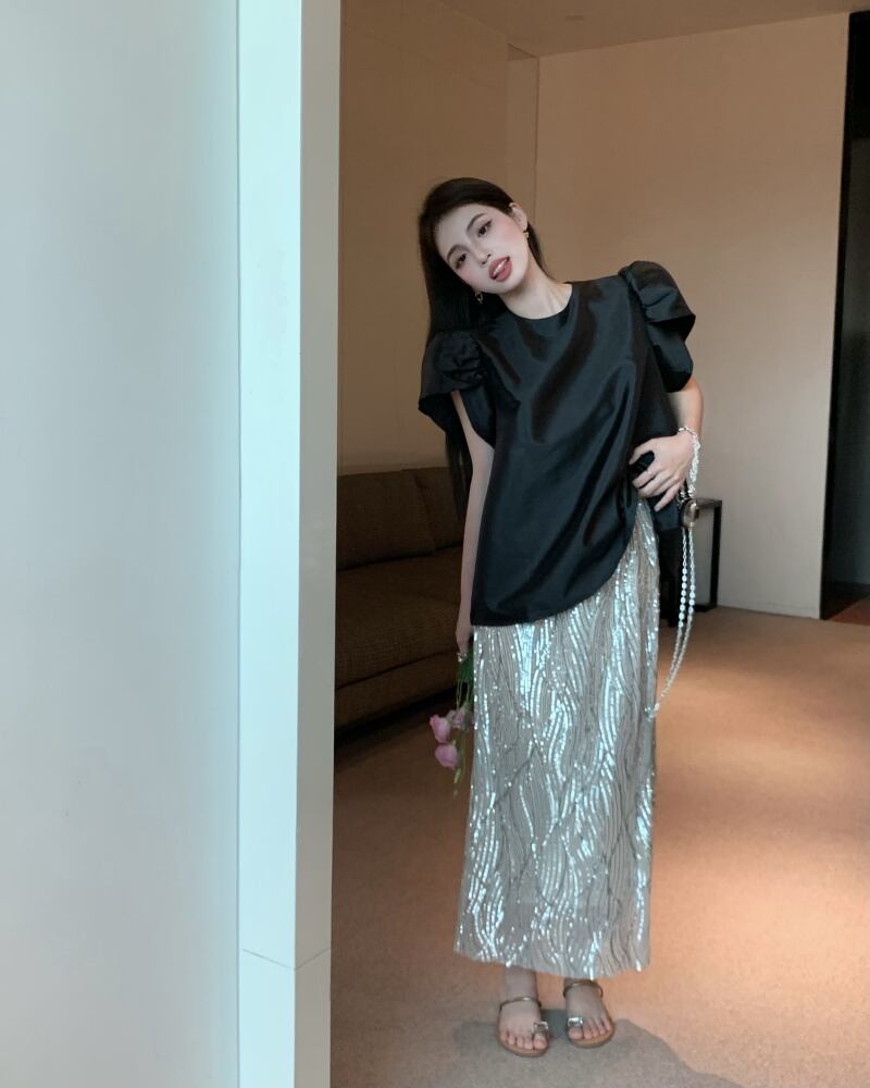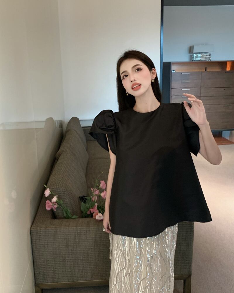 -quality black chic puff sleeve shirt women's summer 2022 new version chic all-match loose top trend ブラック サマー 夏物 0921928501745709