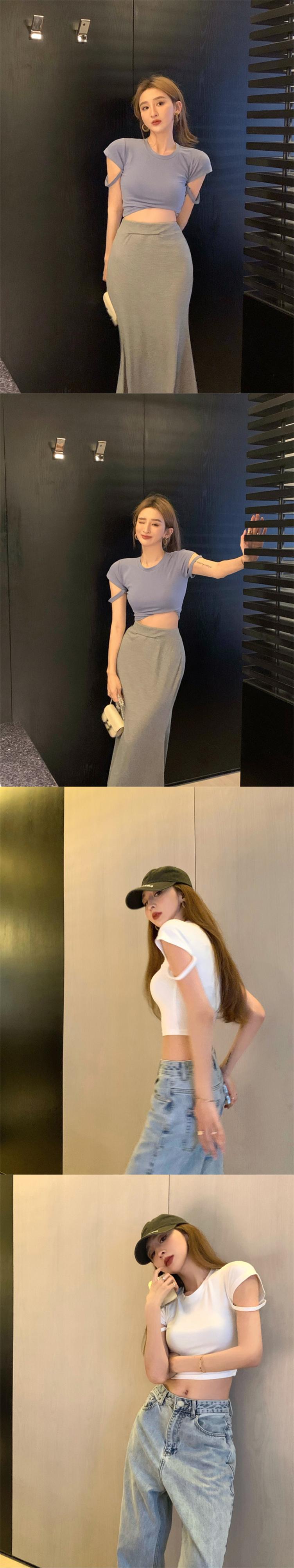 Hot chic hollow short-sleeved T-shirt women's summer 2022 new slim fit and thin solid color all-match short top trendy ショート サマー 夏物 スリム Tシャツ ソリッドカラー 0921912779507683