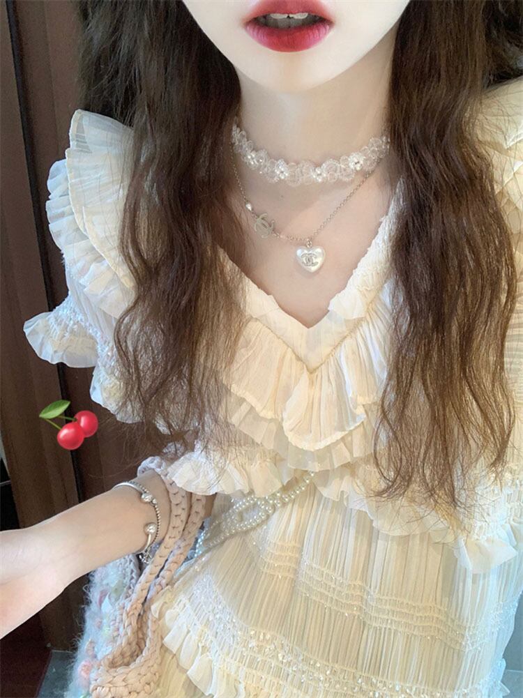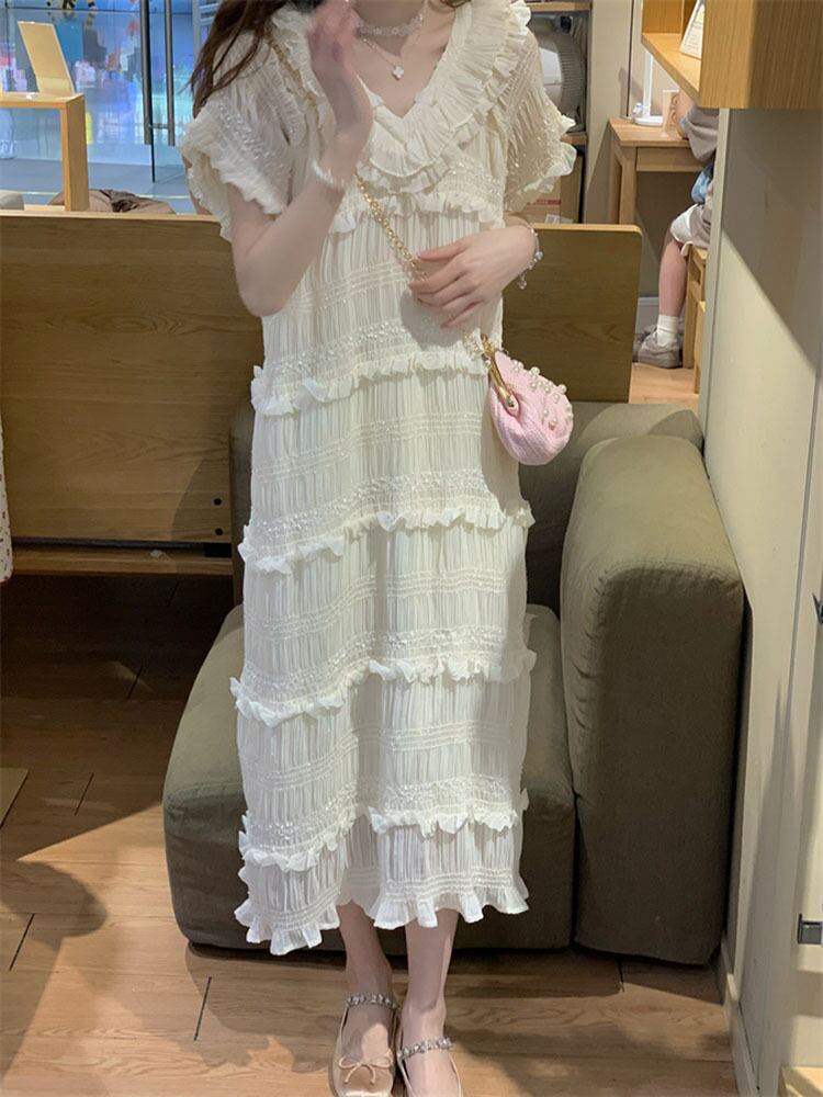 French fairy fungus side trumpet sleeve dress female summer 2022 new pleated waist mid-length skirt trendy プリーツ サマー 夏物 スカート 0921944872938596