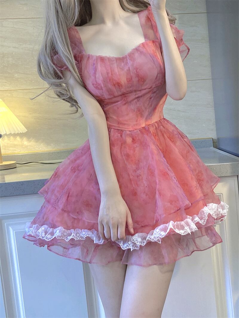 French beautiful floral puff sleeve dress women's summer 2022 new chic waist stitching lace cake skirt レース サマー 夏物 花柄 スカート ステッチ 0921925599429492