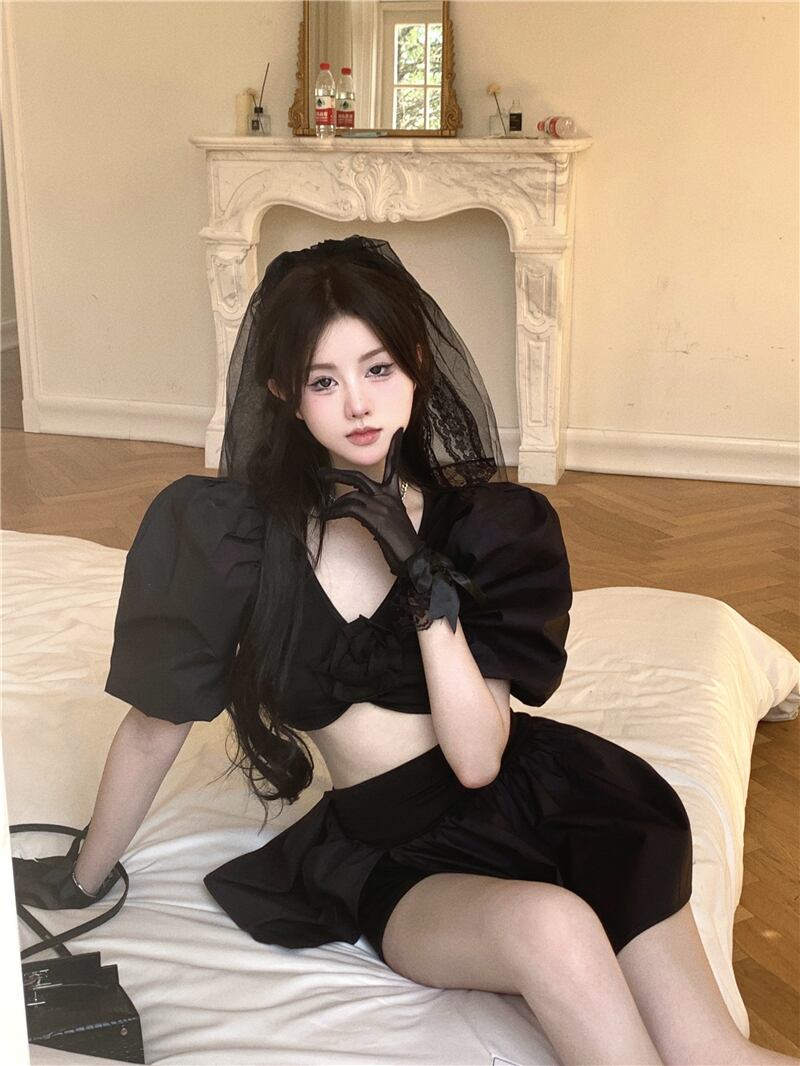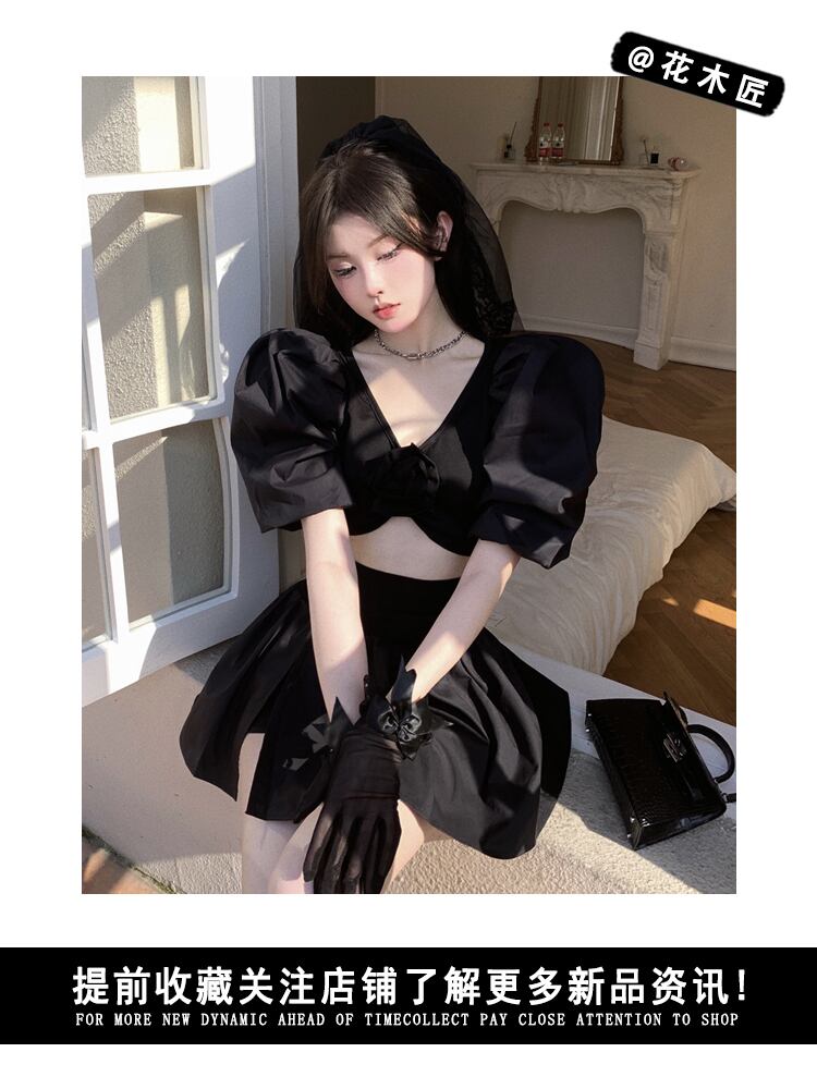 -end black fashion suit female summer 2022 new temperament V-neck puff sleeve shirt short skirt two-piece set ショート ブラック サマー 夏物 スカート Vネック 092198302649667