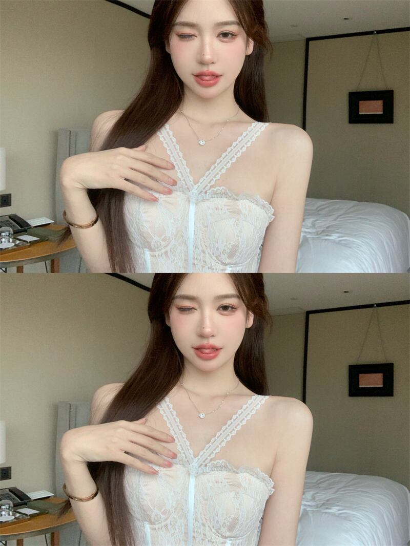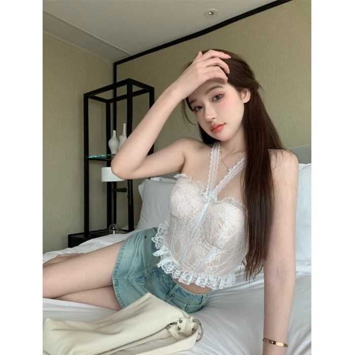Pure Desire Heavy Industry fishbone lace halterneck vest women's outer wear summer 2022 new sweet temperament short tops trend ショート レース 大人ガーリー スウィート キュート カジュアル サマー 夏物 0921917833602152